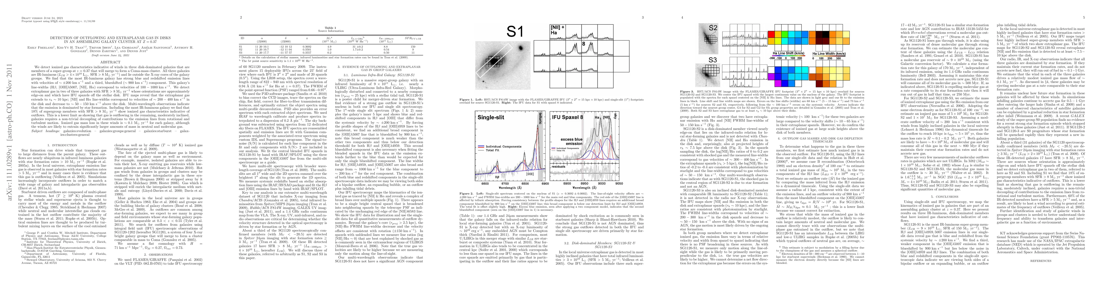 The study detects outflowing and extraplanar gas in disk galaxies of a merging galaxy cluster at z=0.37. Using Integral Field Unit (IFU) spectroscopy, it finds strong emission lines in three IR-luminous galaxies, indicating winds with velocities of 100-1000 km/s. Extraplanar gas extends up to 10 kpc, with velocities decreasing above the disk. Approximately 18% of high SFR supergroup members show outflow characteristics, suggesting significant mass loss of ~0.1 M_sun/year per galaxy, potentially entraining more mass in neutral and molecular gas.