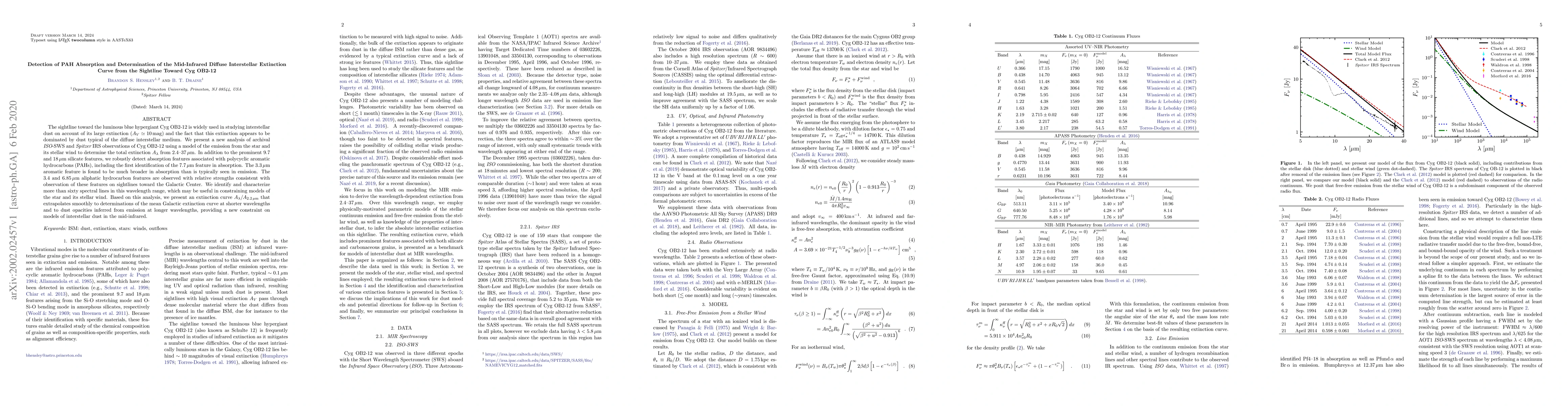 This paper analyzes archival ISO-SWS and Spitzer IRS observations of Cyg OB2-12 to determine the mid-infrared diffuse interstellar extinction curve, detecting PAH absorption features and identifying over sixty spectral lines. The study provides a new constraint on interstellar dust models by extrapolating the extinction curve to shorter wavelengths.
