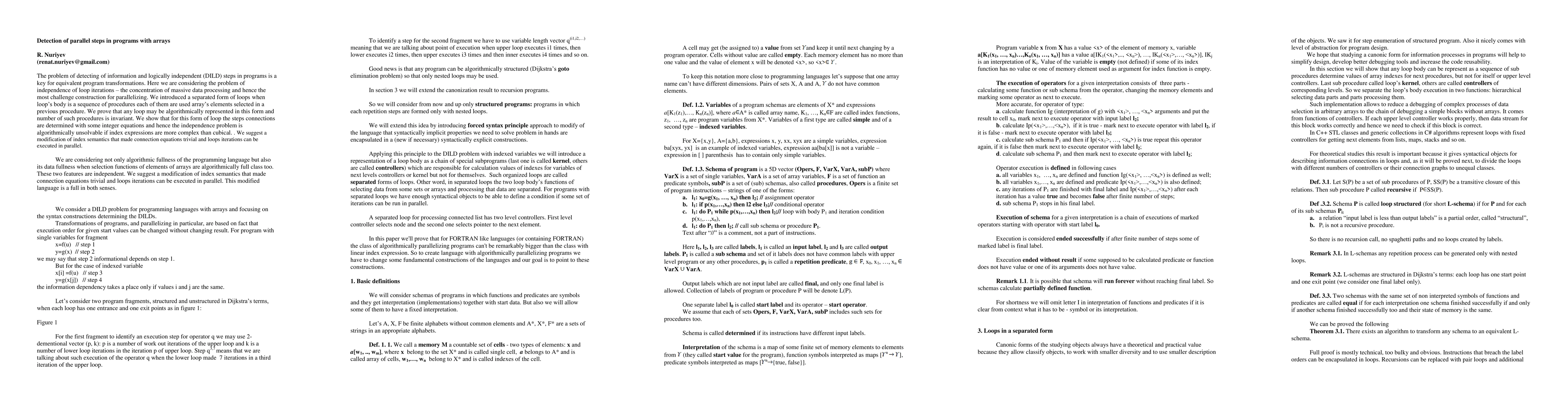 The problem of detecting of information and logically independent (DILD) steps in programs is a key for equivalent program transformations. Here we are considering the problem of independence of loop iterations, the concentration of massive data processing and hence the most challenge construction for parallelizing. We introduced a separated form of loops when loop's body is a sequence of procedures each of them are used array's elements selected in a previous procedure. We prove that any loop may be algorithmically represented in this form and number of such procedures is invariant. We show that for this form of loop the steps connections are determined with some integer equations and hence the independence problem is algorithmically unsolvable if index expressions are more complex than cubical. We suggest a modification of index semantics that made connection equations trivial and loops iterations can be executed in parallel.
