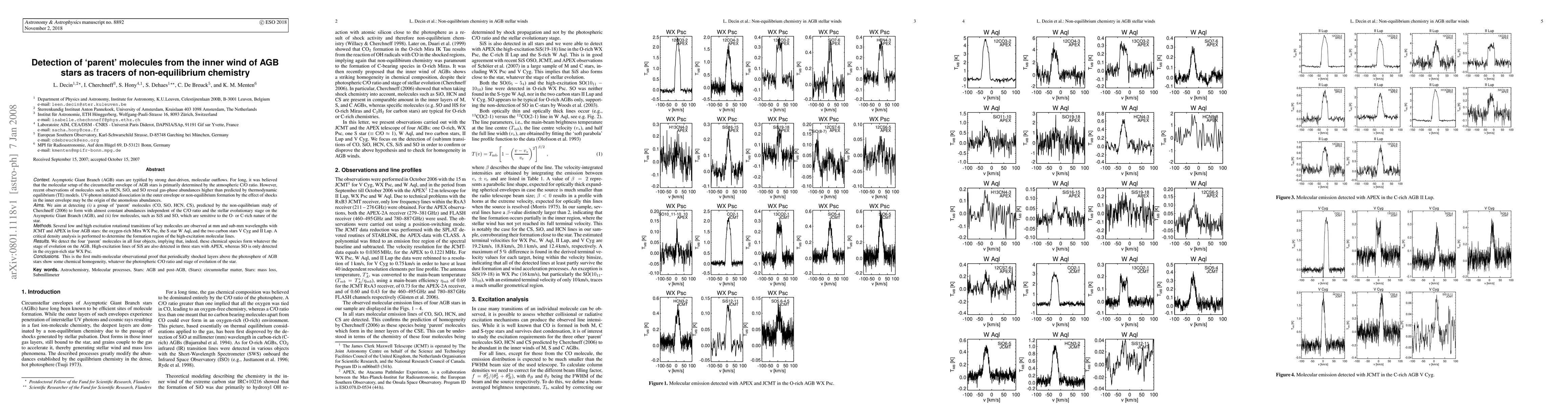 Asymptotic Giant Branch (AGB) stars are typified by strong dust-driven, molecular outflows. For long, it was believed that the molecular setup of the circumstellar envelope of AGB stars is primarily determined by the atmospheric C/O ratio. However, recent observations of molecules such as HCN, SiO, and SO reveal gas-phase abundances higher than predicted by thermodynamic equilibrium (TE) models. UV-photon initiated dissociation in the outer envelope or non-equilibrium formation by the effect of shocks in the inner envelope may be the origin of the anomolous abundances. We aim at detecting (i.) a group of `parent' molecules (CO, SiO, HCN, CS), predicted by the non-equilibrium study of Cherchneff (2006) to form with almost constant abundances independent of the C/O ratio and the stellar evolutionary stage on the Asymptotic Giant Branch (AGB), and (ii.) few molecules, such as SiS and SO,which are sensitive to the O- or C-rich nature of the star. Several low and high excitation rotational transitions of key molecules are observed at mm and sub-mm wavelengths with JCMT and APEX in four AGB stars: the oxygen-rich Mira WX Psc, the S star W Aql, and the two carbon stars V Cyg and II Lup. A critical density analysis is performed to determine the formation region of the high-excitation molecular lines. We detect the four `parent' molecules in all four objects, implying that, indeed, these chemical species form whatever the stage of evolution on the AGB. High-excitation lines of SiS are also detected in three stars with APEX, whereas SO is only detected in the oxygen-rich star WX Psc. This is the first multi-molecular observational proof that periodically shocked layers above the photosphere of AGB stars show some chemical homogeneity, whatever the photospheric C/O ratio and stage of evolution of the star.