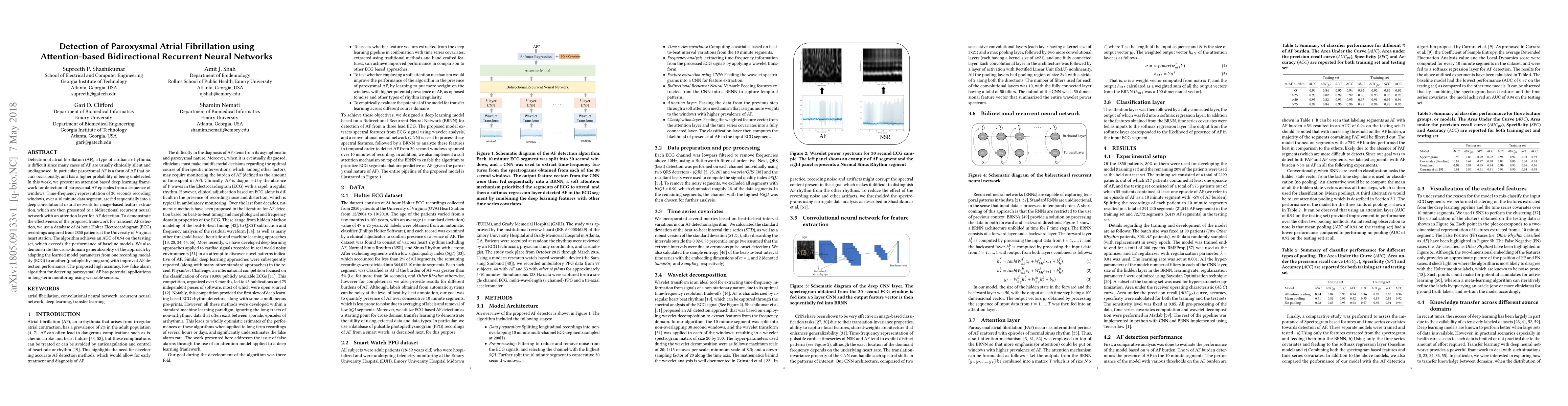 This paper proposes an attention-based bidirectional recurrent neural network for detecting paroxysmal atrial fibrillation from ECG recordings, achieving an AUC of 0.94. The model demonstrates cross-domain adaptability and holds promise for long-term monitoring using wearable sensors.