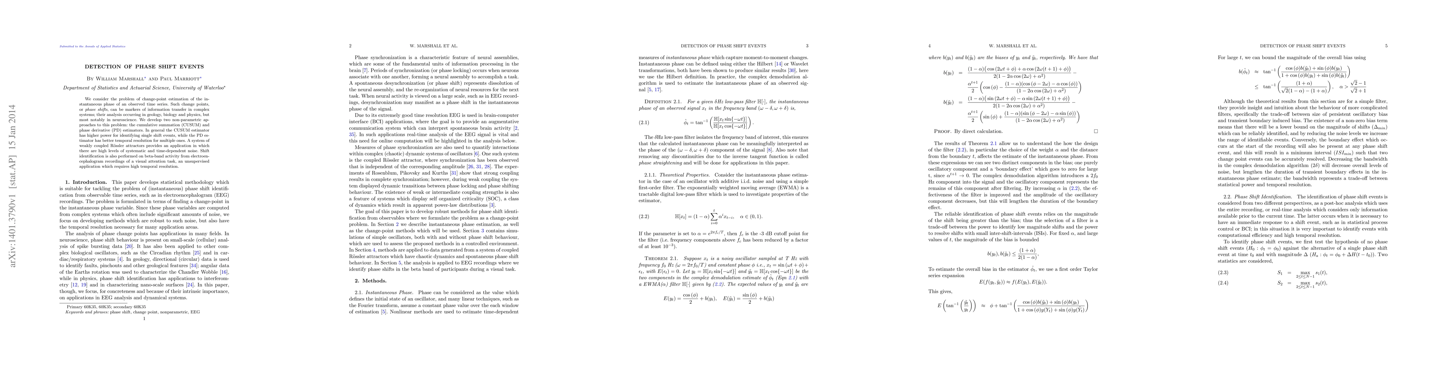 We consider the problem of change-point estimation of the instantaneous phase of an observed time series. Such change points, or phase shifts, can be markers of information transfer in complex systems; their analysis occurring in geology, biology and physics, but most notably in neuroscience. We develop two non-parametric approaches to this problem: the cumulative summation (CUSUM) and phase derivative (PD) estimators. In general the CUSUM estimator has higher power for identifying single shift events, while the PD estimator has better temporal resolution for multiple ones. A system of weakly coupled Rossler attractors provides an application in which there are high levels of systematic and time-dependent noise. Shift identification is also performed on beta-band activity from electroencephalogram recordings of a visual attention task, an unsupervised application which requires high temporal resolution.