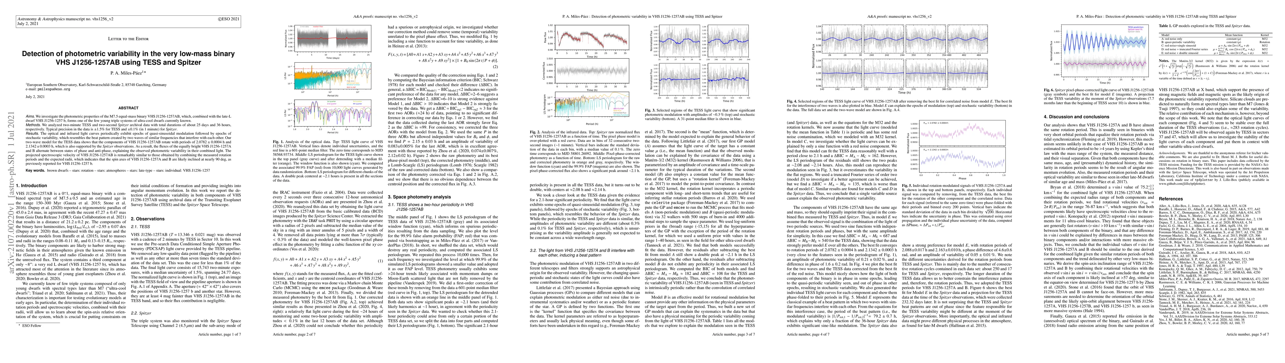 This study investigates the photometric variability of the M7.5 binary VHS J1256-1257AB using TESS and Spitzer data, revealing quasi-sinusoidal modulation and stochastic variability. The analysis indicates rotation periods of 2.0782±0.0004 h and 2.1342±0.0003 h, explaining the alternating flux states and confirming near 90-degree spin axis inclinations.