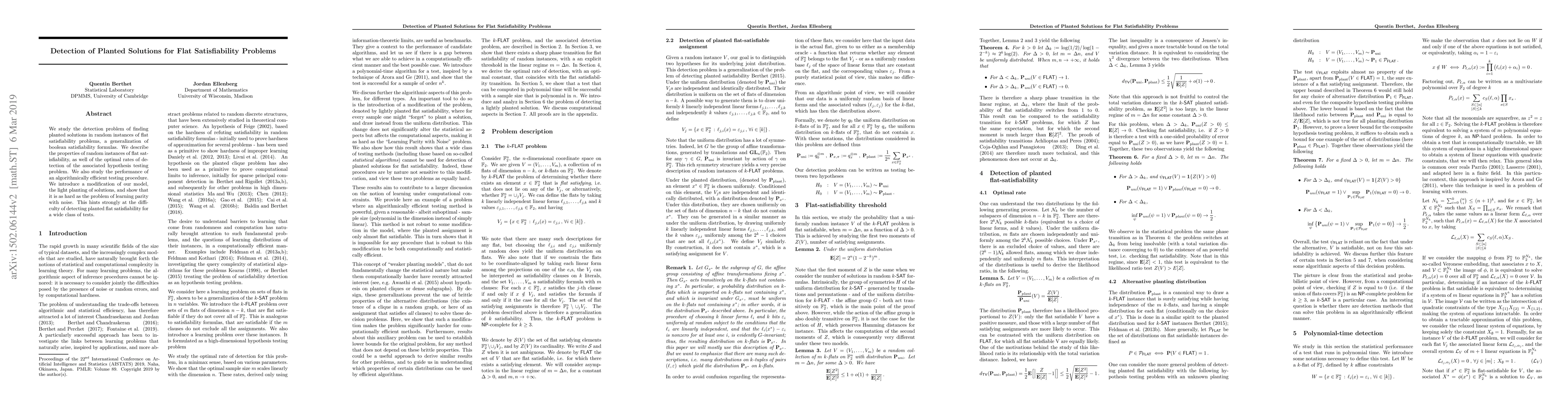 This paper investigates the detection of planted solutions in random instances of flat satisfiability problems, exploring optimal detection rates and efficient testing procedures. It introduces a modified model, light planting, which is shown to be as challenging as learning parity with noise, indicating the inherent difficulty in detecting such solutions.