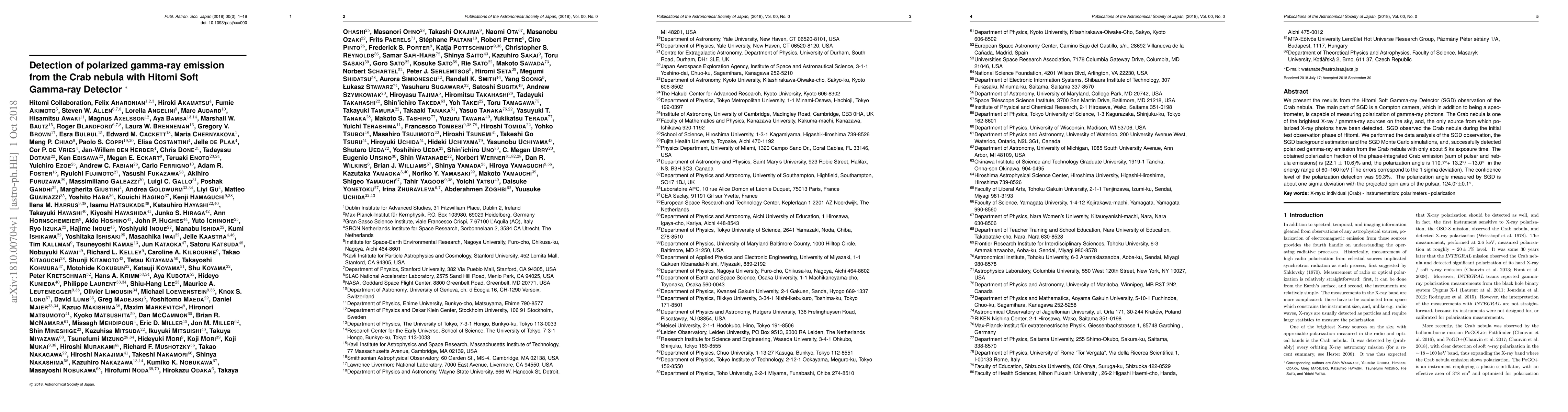 The Hitomi Soft Gamma-ray Detector (SGD) successfully detected polarized gamma-ray emission from the Crab nebula with a 5 ks exposure, revealing a polarization fraction of (22.1 ± 10.6)% and a polarization angle of 110.7° ± 13.2° in the energy range of 60-160 keV, with a 99.3% confidence level. The polarization angle aligns within one sigma deviation from the pulsar's projected spin axis.