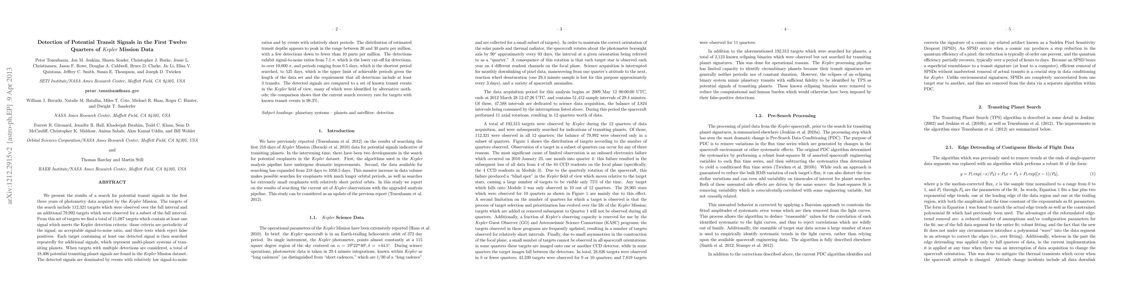 This study identifies 18,406 potential transit signals in the first 12 quarters of Kepler Mission data, focusing on 192,313 targets. The detected signals meet criteria of periodicity, signal-to-noise ratio, and false positive rejection, with a recovery rate of 98.3% for known transits.