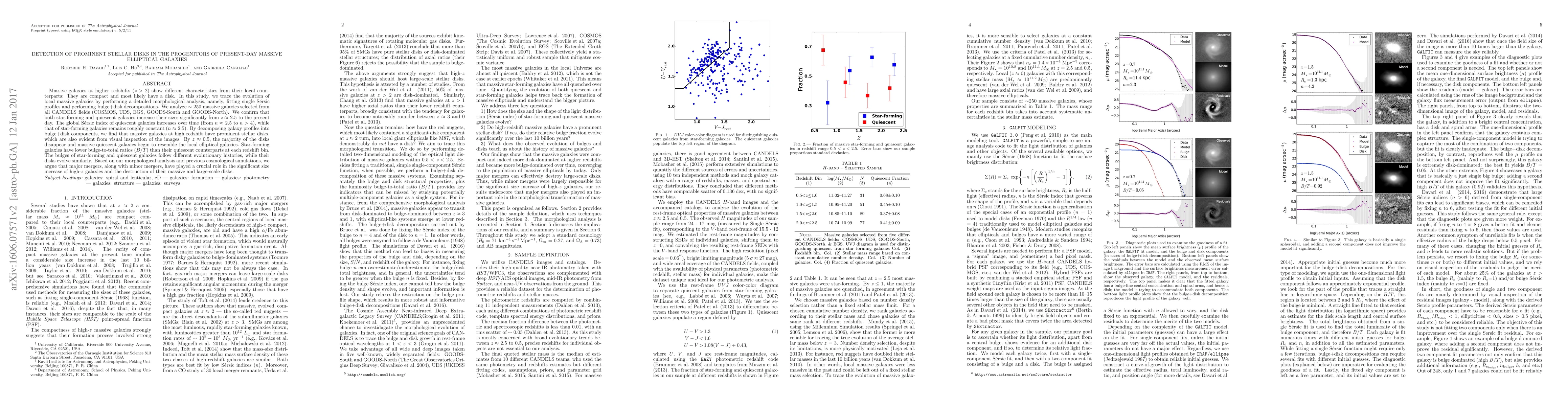 Massive galaxies at higher redshifts ($\emph{z}$ $>$ 2) show different characteristics from their local counterparts: They are compact and most likely have a disk. In this study, we trace the evolution of local massive galaxies by performing a detailed morphological analysis, namely, fitting single S\'{e}rsic profiles and performing bulge+disk decompositions. We analyze $\sim$ 250 massive galaxies selected from all CANDELS fields (COSMOS, UDS, EGS, GOODS-South and GOODS-North). We confirm that both star-forming and quiescent galaxies increase their sizes significantly from $\emph{z}$ $\approx$ 2.5 to the present day. The global S\'{e}rsic index of quiescent galaxies increases over time (from $n$ $\approx$ 2.5 to $n$ $>$ 4), while that of star-forming galaxies remains roughly constant ($n$ $\approx$ 2.5). By decomposing galaxy profiles into bulge+disk components, we find that massive galaxies at high redshift have prominent stellar disks, which are also evident from visual inspection of the images. By $z$ $\approx$ 0.5, the majority of the disks disappear and massive quiescent galaxies begin to resemble the local elliptical galaxies. Star-forming galaxies have lower bulge-to-total ratios ($B/T$) than their quiescent counterparts at each redshift bin. The bulges of star-forming and quiescent galaxies follow different evolutionary histories, while their disks evolve similarly. We conclude that major mergers, along with minor mergers, have played a crucial role in the significant size increase of high-\emph{z} galaxies and the destruction of their massive and large-scale disks.