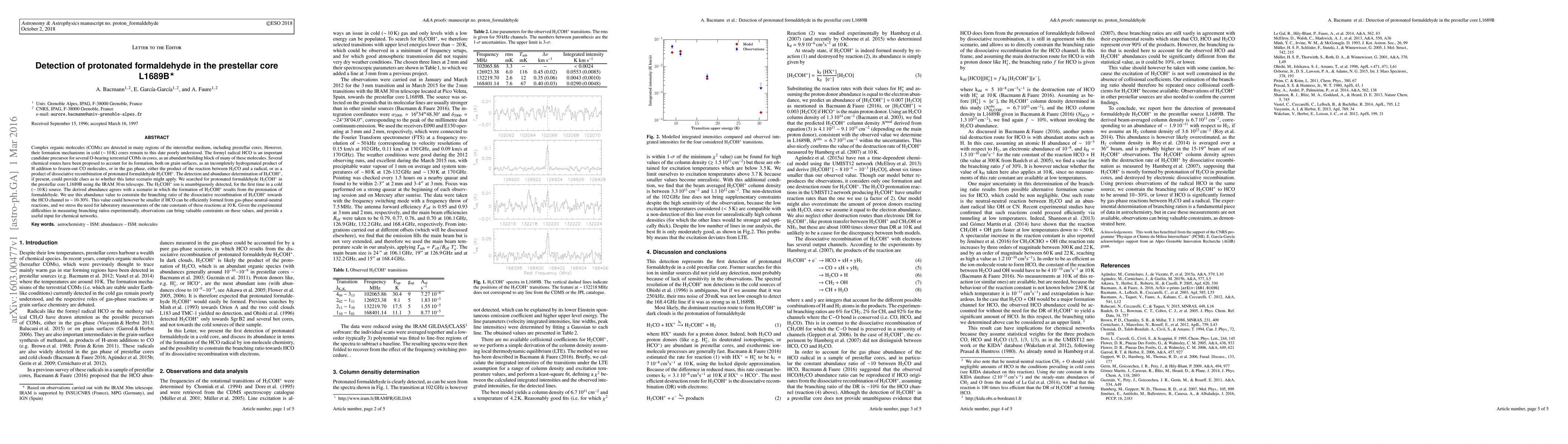 The paper reports the first detection of protonated formaldehyde H2COH+ in the prestellar core L1689B, providing evidence supporting its formation via protonation of formaldehyde. This detection helps constrain the branching ratio of its dissociative recombination towards the HCO channel, suggesting it is around 10-30%.