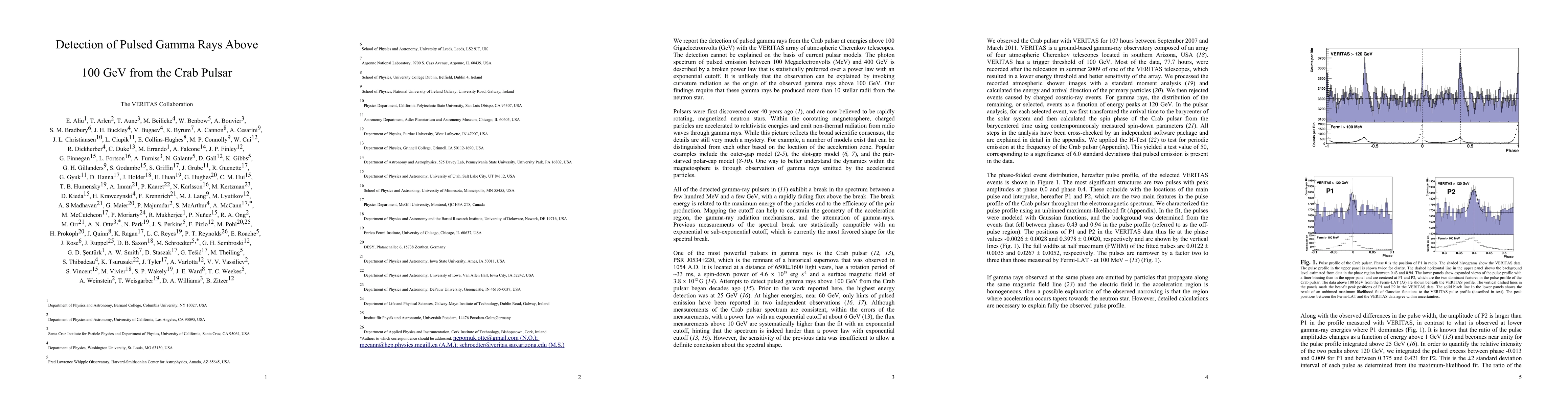 This paper reports the detection of pulsed gamma rays from the Crab pulsar at energies exceeding 100 GeV using the VERITAS telescope array, challenging current pulsar models. The observed photon spectrum follows a broken power law, suggesting the gamma rays originate more than 10 stellar radii from the neutron star.