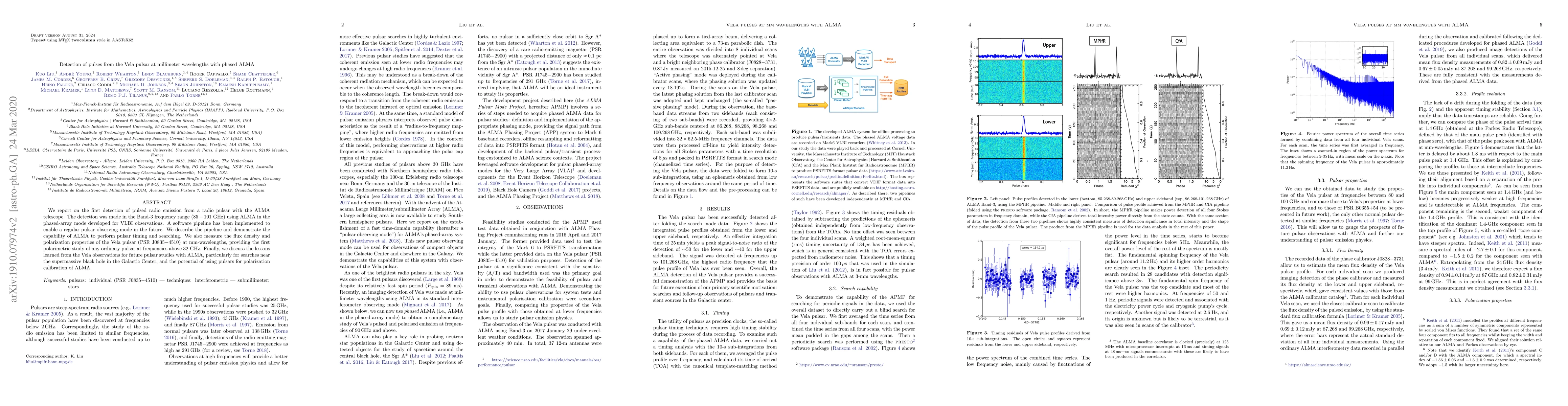 This paper reports the first detection of pulsed radio emission from the Vela pulsar using the ALMA telescope in the millimeter wavelength range, showcasing ALMA's potential for future pulsar timing and searching. The study also measures the flux density and polarization of the pulsar, providing valuable insights for future pulsar observations and polarization calibration.