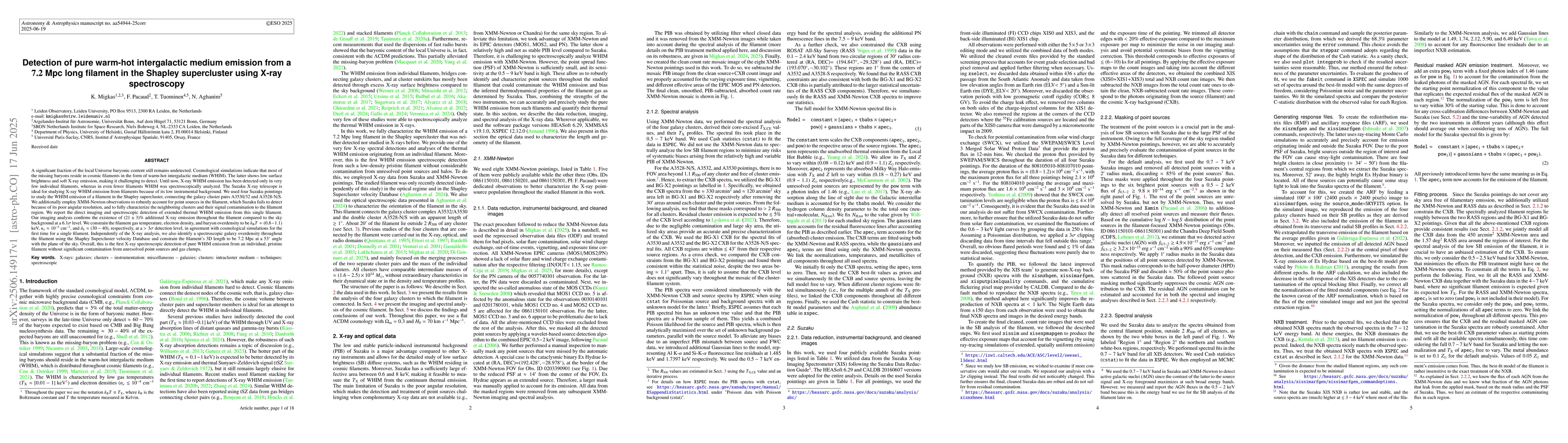 A significant fraction of the local Universe's baryonic content remains undetected. Cosmological simulations indicate that most of the missing baryons reside in cosmic filaments in the form of warm-hot intergalactic medium (WHIM). The latter shows low surface brightness and soft X-ray emission, making it challenging to detect. Until now, X-ray WHIM emission has been detected only in very few individual filaments, whereas in even fewer filaments, WHIM has been spectroscopically analyzed. In this work, we used four Suzaku pointings to study the WHIM emission of a filament in the Shapley supercluster, connecting the galaxy cluster pairs A3530/32 and A3528-N/S. We additionally employ XMM-Newton observations to robustly account for point sources in the filament and to fully characterize the neighboring clusters and their signal contamination to the filament region. We report the direct imaging and spectroscopic detection of extended thermal WHIM emission from this single filament. Our imaging analysis confirms the existence of $(21\pm 3)\% $ excess X-ray emission throughout the filament compared to the sky background at a $6.1\sigma$ level. We constrain the filament gas temperature, electron density, and baryon overdensity to be $k_{\text{B}}T\approx (0.8-1.1)$ keV, $n_{\text{e}}\approx 10^{-5}$ cm$^{-3}$, and $\delta_{\text{b}}\approx (30-40)$, respectively, at a $>3\sigma$ detection level, in agreement with cosmological simulations for the first time for a single filament. Independent of the X-ray analysis, we also identify a spectroscopic galaxy overdensity throughout the filament using the Shapley Supercluster velocity Database and constrain the filament's 3D length to be 7.2 Mpc. Overall, this is the first X-ray spectroscopic detection of pure WHIM emission from an individual, pristine filament without significant contamination from unresolved point sources and gas clumps.