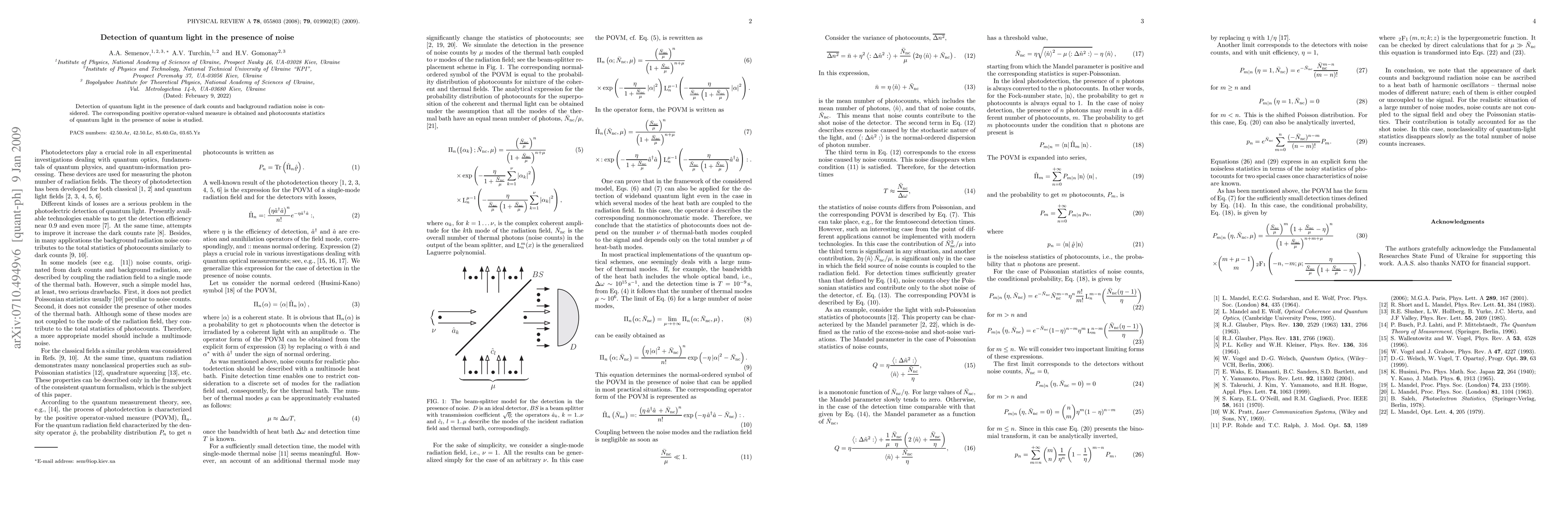 This paper investigates detecting quantum light amidst noise, using a positive operator-valued measure to analyze photocount statistics under dark counts and background radiation.