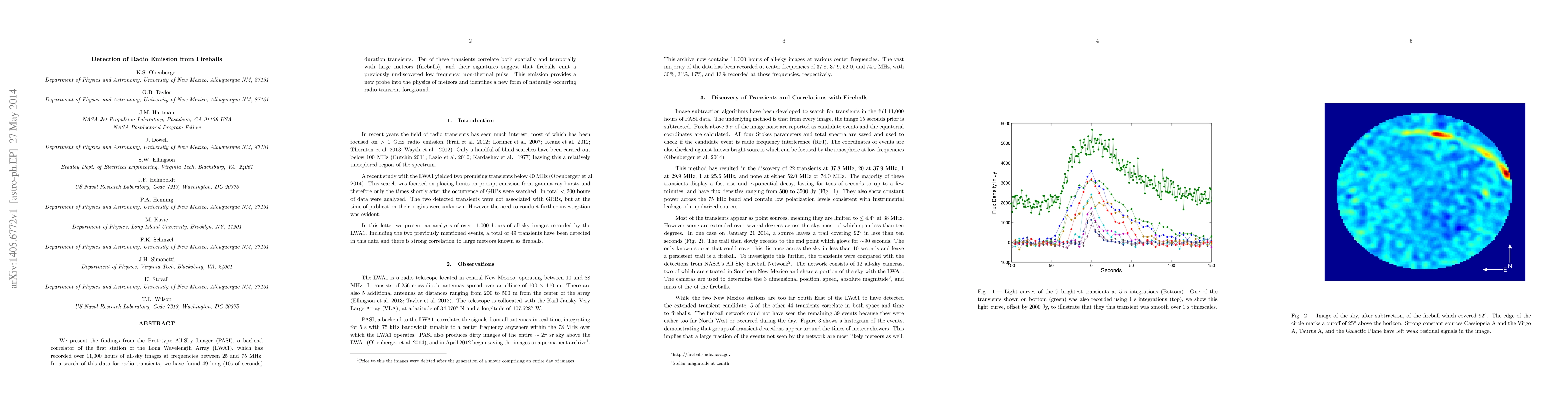 The Prototype All-Sky Imager (PASI) detected 49 long-duration radio transients between 25 and 75 MHz, with 10 correlating with fireballs, revealing a previously unknown low-frequency, non-thermal emission from these meteors. This discovery offers new insights into meteor physics and identifies a new type of natural radio transient.