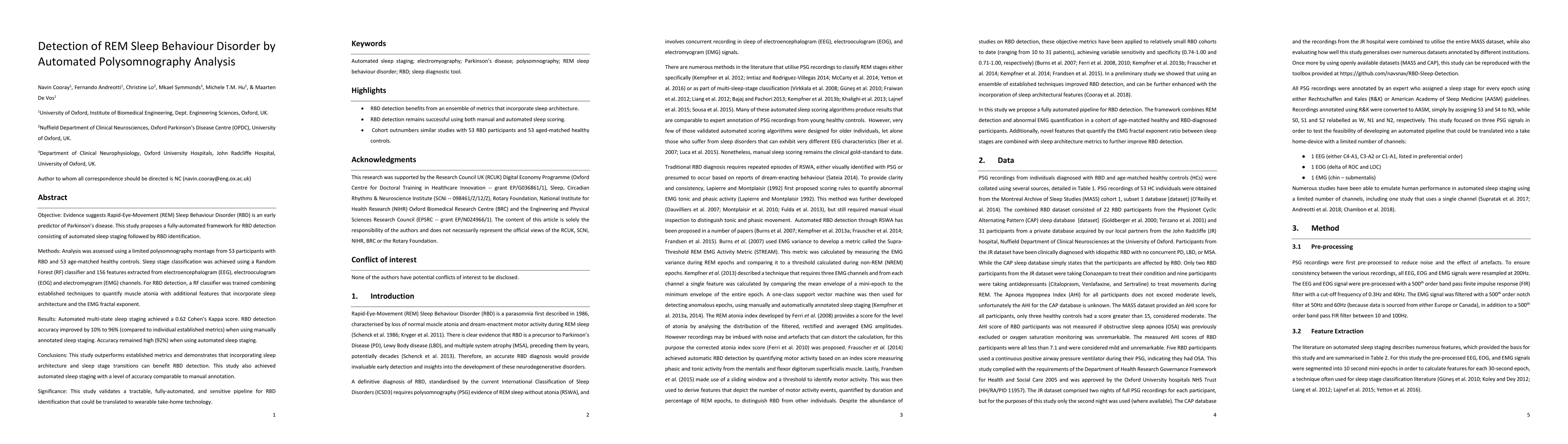 This research contributes to the development of more accurate sleep stage classification algorithms for RBD detection, which has significant implications for clinical diagnosis and treatment.