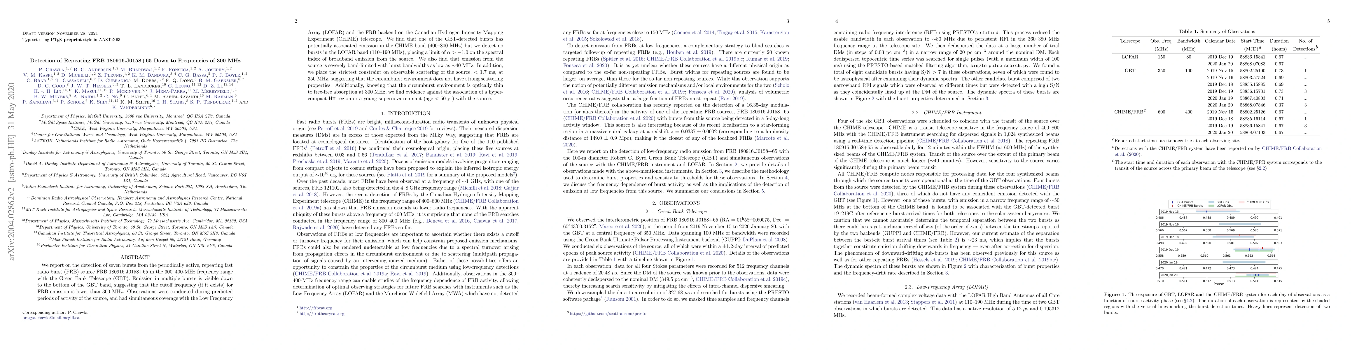 Researchers detected 7 bursts from FRB 180916.J0158+65 in the 300-400 MHz frequency range, suggesting a lower cutoff frequency for FRB emission than previously thought. The study also places constraints on the source's spectral index, burst bandwidths, and circumburst environment properties.