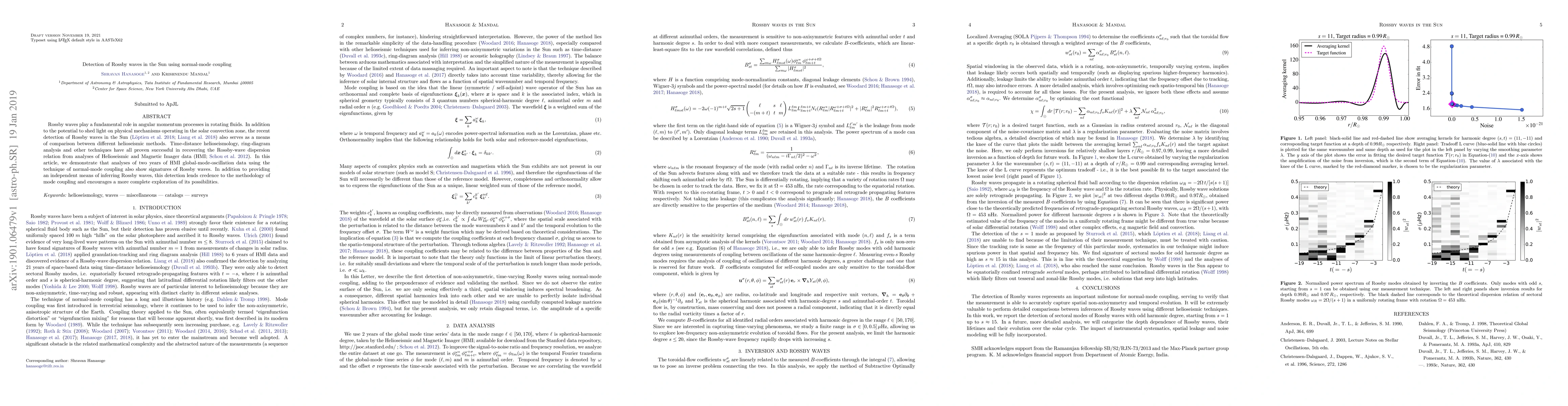 This paper demonstrates the detection of Rossby waves in the Sun using normal-mode coupling analysis of two years of global-mode-oscillation data from the HMI. This method provides an independent verification of Rossby waves and supports the potential of mode coupling for further helioseismic studies.