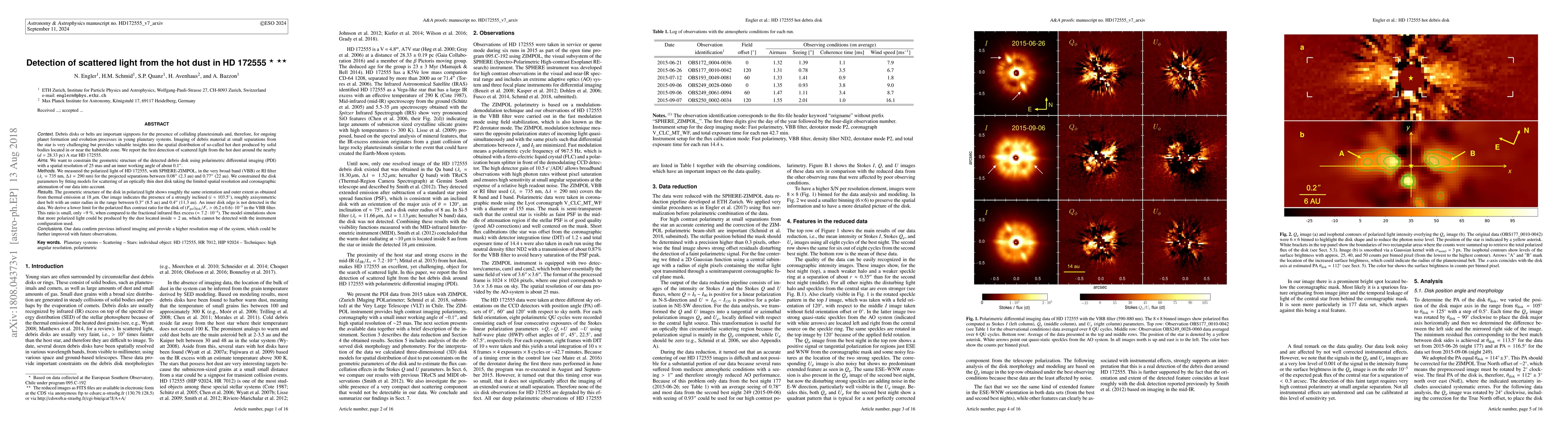 This paper reports the first detection of scattered light from hot dust around the star HD 172555 using polarimetric differential imaging. The study reveals a strongly inclined, axisymmetric dust belt with an outer radius between 8.5 and 11.3 au, and a polarized flux contrast ratio of 6.2 x 10^-5, indicating a small but significant contribution to the star's light.