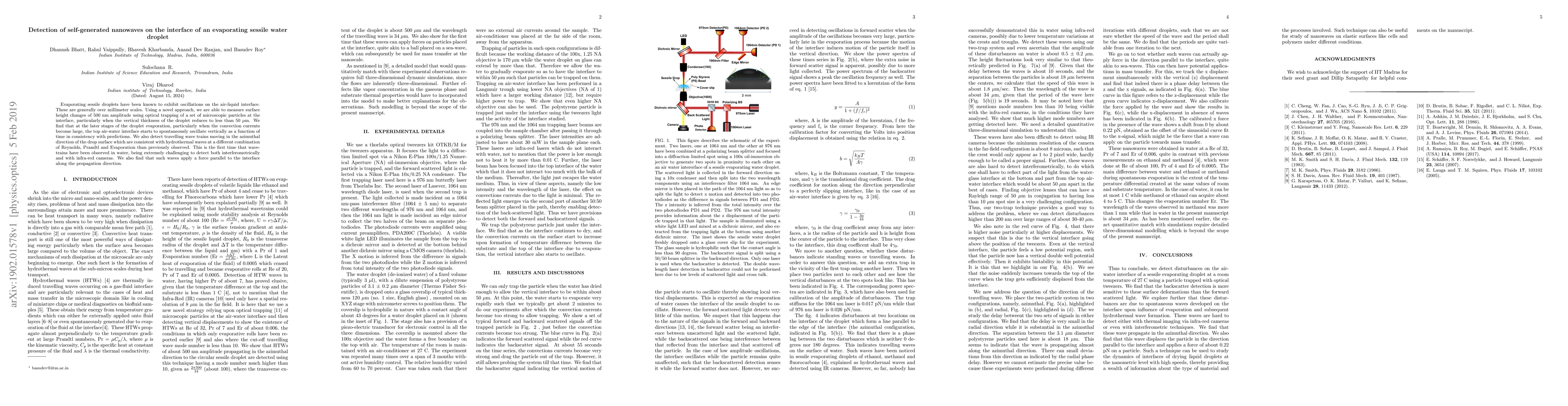 Evaporating sessile droplets have been known to exhibit oscillations on the air-liquid interface. These are generally over millimeter scales. Using a novel approach, we are able to measure surface height changes of 500 nm amplitude using optical trapping of a set of microscopic particles at the interface, particularly when the vertical thickness of the droplet reduces to less than 50 $\mu$m. We find that at the later stages of the droplet evaporation, particularly when the convection currents become large, the top air-water interface starts to spontaneously oscillate vertically as a function of time in consistency with predictions. We also detect travelling wave trains moving in the azimuthal direction of the drop surface which are consistent with hydrothermal waves at a different combination of Reynolds, Prandtl and Evaporation than previously observed. This is the first time that wave-trains have been observed in water, being extremely challenging to detect both interferometrically and with infra-red cameras. We also find that such waves apply a force parallel to the interface along the propagation direction.