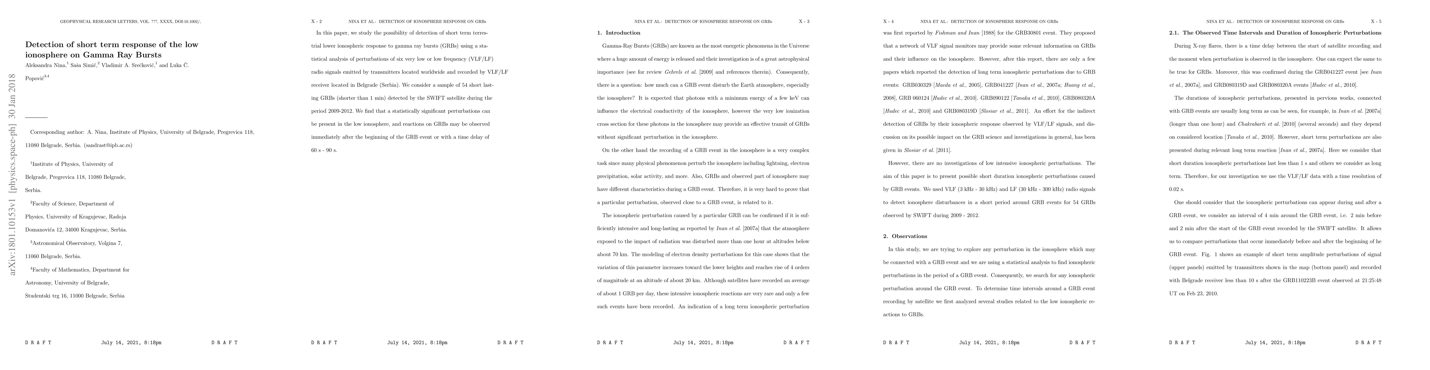 This paper investigates the short-term terrestrial lower ionospheric response to gamma ray bursts (GRBs) using statistical analysis of perturbations in VLF/LF radio signals. The study finds significant ionospheric perturbations immediately after or with a delay of 60-90 seconds following the onset of GRBs detected by the SWIFT satellite.