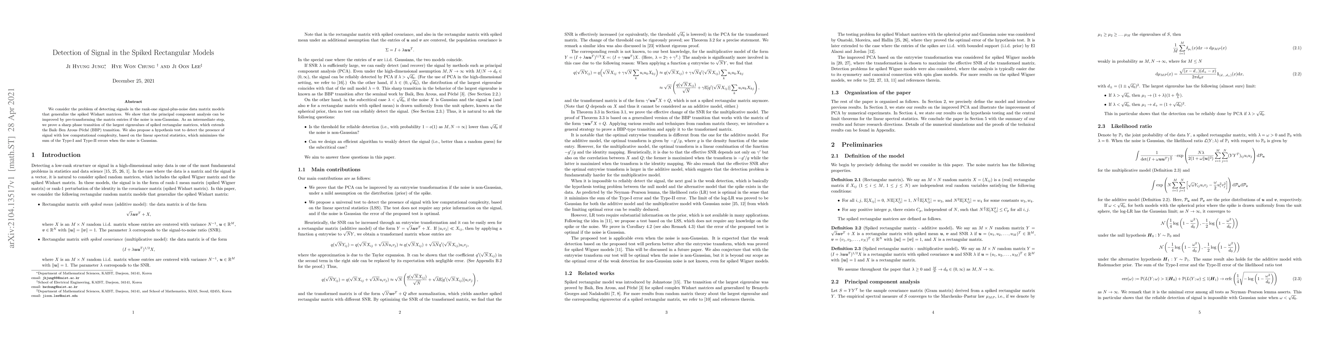 We consider the problem of detecting signals in the rank-one signal-plus-noise data matrix models that generalize the spiked Wishart matrices. We show that the principal component analysis can be improved by pre-transforming the matrix entries if the noise is non-Gaussian. As an intermediate step, we prove a sharp phase transition of the largest eigenvalues of spiked rectangular matrices, which extends the Baik-Ben Arous-P\'ech\'e (BBP) transition. We also propose a hypothesis test to detect the presence of signal with low computational complexity, based on the linear spectral statistics, which minimizes the sum of the Type-I and Type-II errors when the noise is Gaussian.
