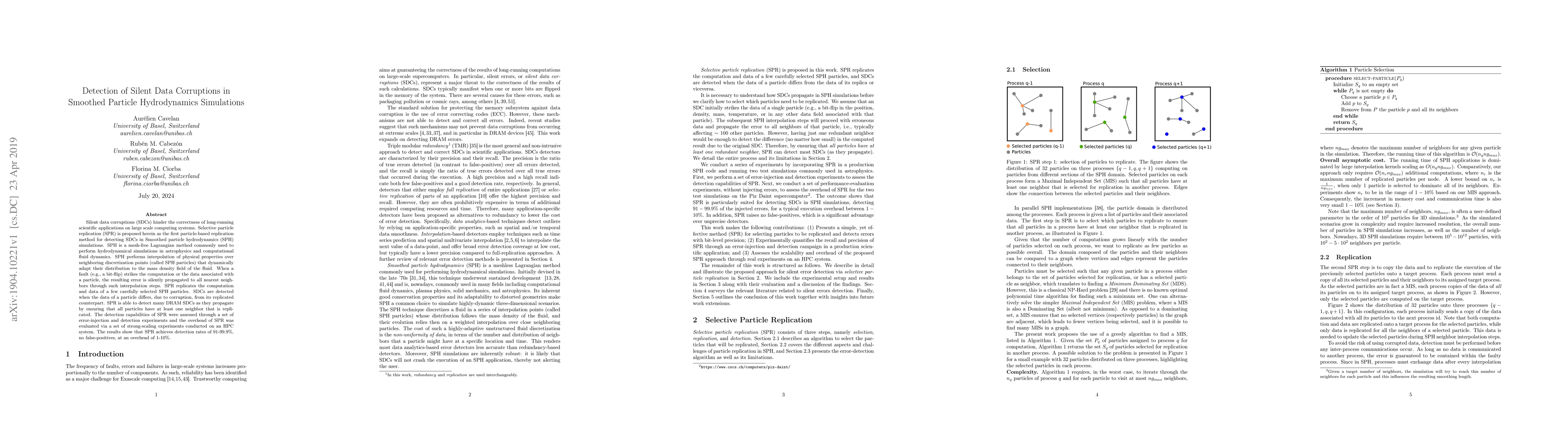 The paper proposes selective particle replication (SPR) to detect silent data corruptions (SDCs) in Smoothed Particle Hydrodynamics (SPH) simulations, achieving 91-99.9% detection rates with no false positives and an overhead of 1-10%. SPR replicates selected SPH particles to identify corruptions that propagate through interpolation.