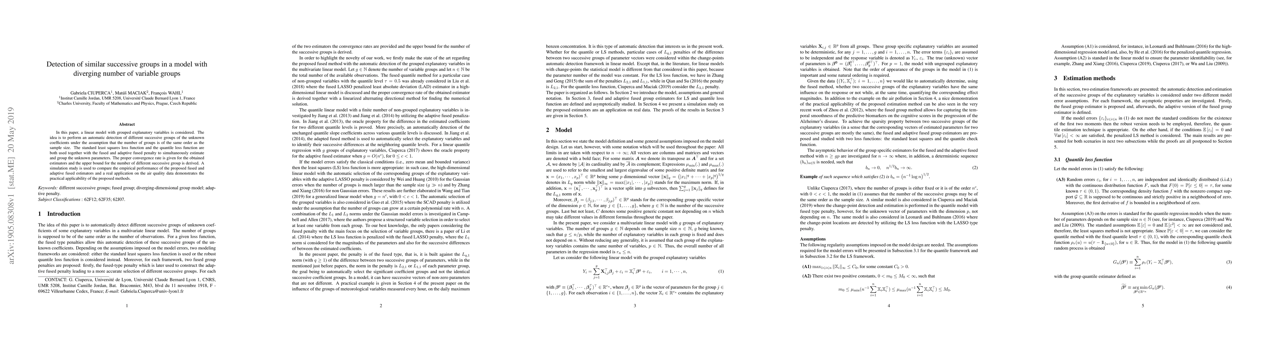 This paper proposes a method to detect similar successive groups in a linear model with grouped explanatory variables, using fused and adaptive fused penalty estimators. It demonstrates the practical applicability of these methods through a simulation study and real-world air quality data application.