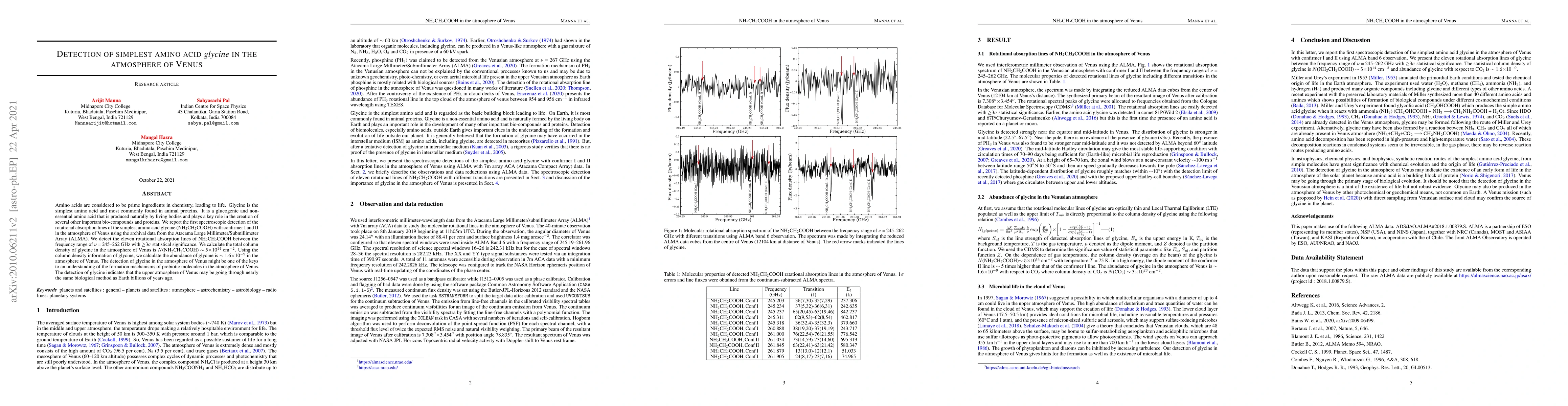 This paper reports the first spectroscopic detection of glycine, the simplest amino acid, in the atmosphere of Venus using ALMA data, finding eleven rotational absorption lines with a calculated abundance of ~1.6×10$^{-9}$. This discovery suggests potential prebiotic chemical processes in Venus's atmosphere.