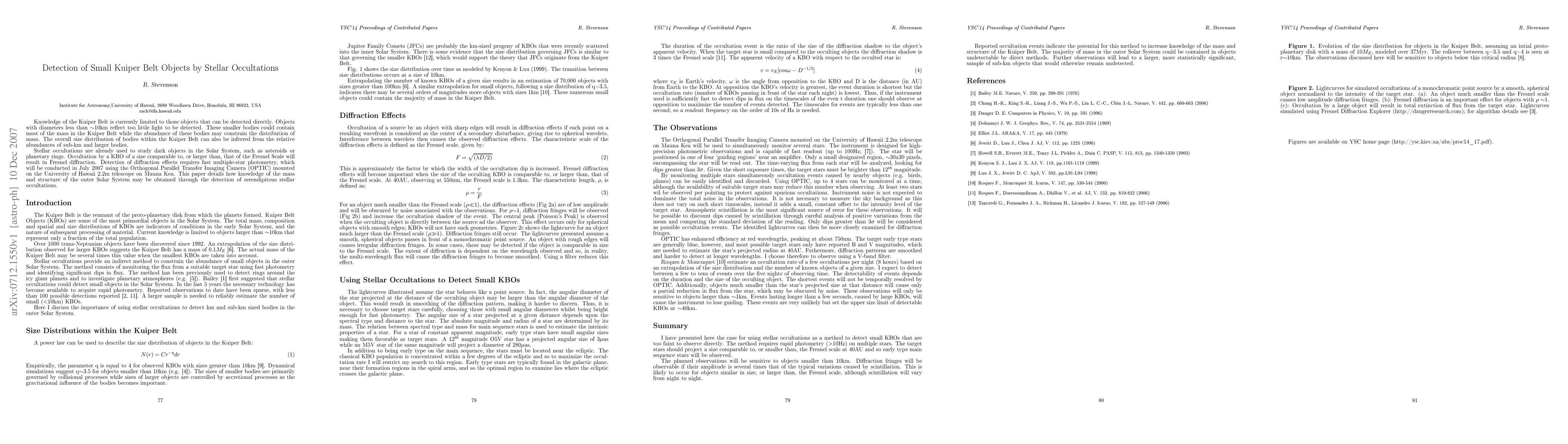 This paper explores the use of stellar occultations to detect small Kuiper Belt Objects (KBOs) less than 10km in diameter, which are currently undetectable by direct methods. By employing fast multiple-star photometry during occultations, researchers aim to identify diffraction effects that could reveal the presence of these elusive bodies, thereby enhancing our understanding of the Kuiper Belt's mass distribution and size distribution.