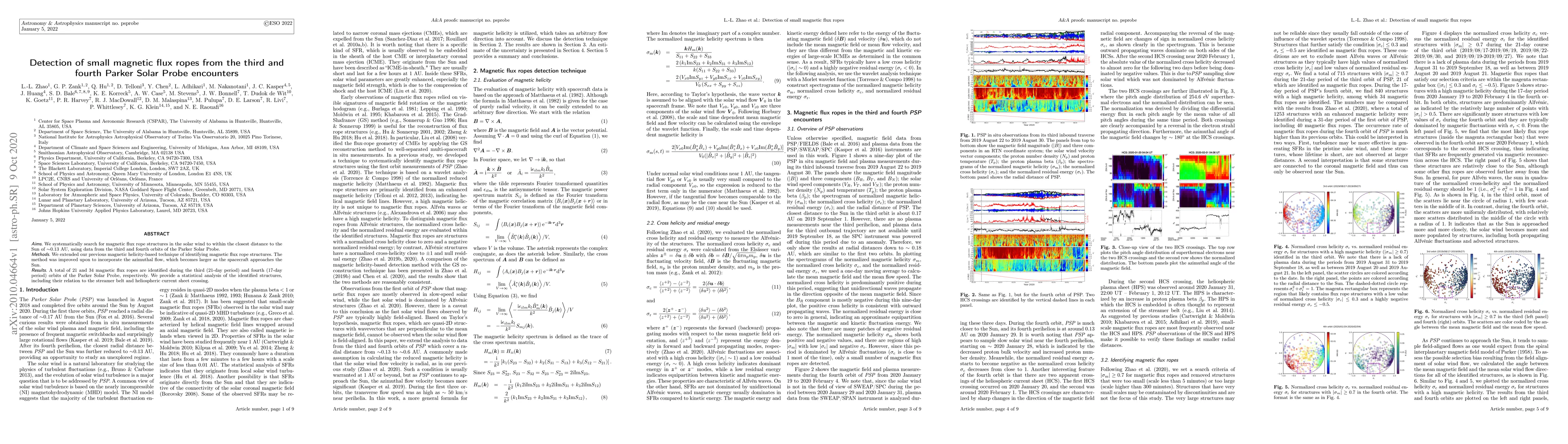 This study identifies magnetic flux ropes in the solar wind using data from the Parker Solar Probe's third and fourth orbits, detecting 21 and 34 such structures respectively. The improved detection method incorporates azimuthal flow, providing a statistical analysis of these structures and their relation to the streamer belt and heliospheric current sheet.