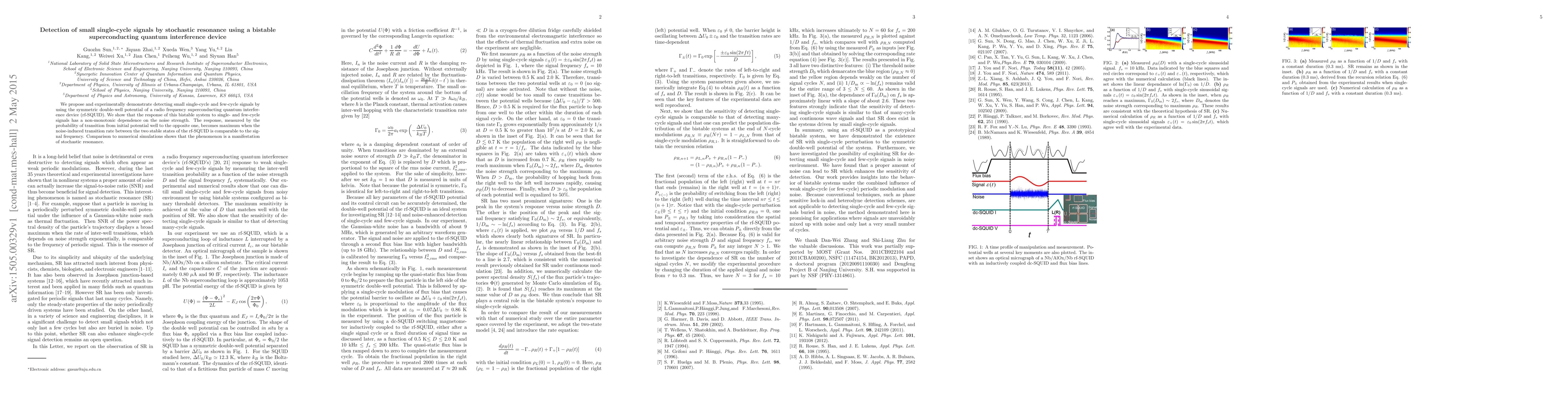 This paper proposes and demonstrates the detection of small single-cycle signals using a bistable superconducting quantum interference device (rf-SQUID) through stochastic resonance. The study finds that the device's response to these signals is maximized when the noise level matches the signal frequency, confirming the phenomenon as stochastic resonance.