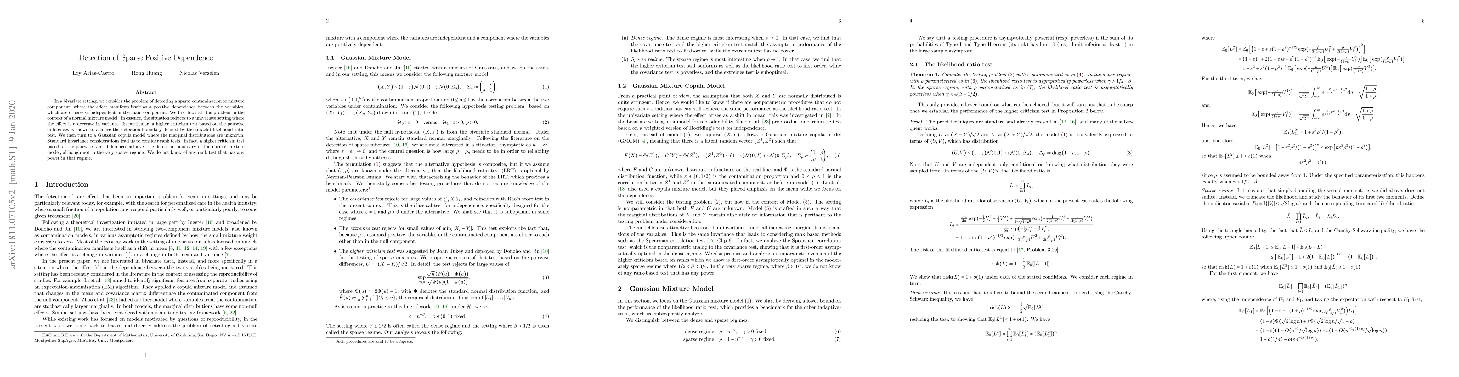 In a bivariate setting, we consider the problem of detecting a sparse contamination or mixture component, where the effect manifests itself as a positive dependence between the variables, which are otherwise independent in the main component. We first look at this problem in the context of a normal mixture model. In essence, the situation reduces to a univariate setting where the effect is a decrease in variance. In particular, a higher criticism test based on the pairwise differences is shown to achieve the detection boundary defined by the (oracle) likelihood ratio test. We then turn to a Gaussian copula model where the marginal distributions are unknown. Standard invariance considerations lead us to consider rank tests. In fact, a higher criticism test based on the pairwise rank differences achieves the detection boundary in the normal mixture model, although not in the very sparse regime. We do not know of any rank test that has any power in that regime.
