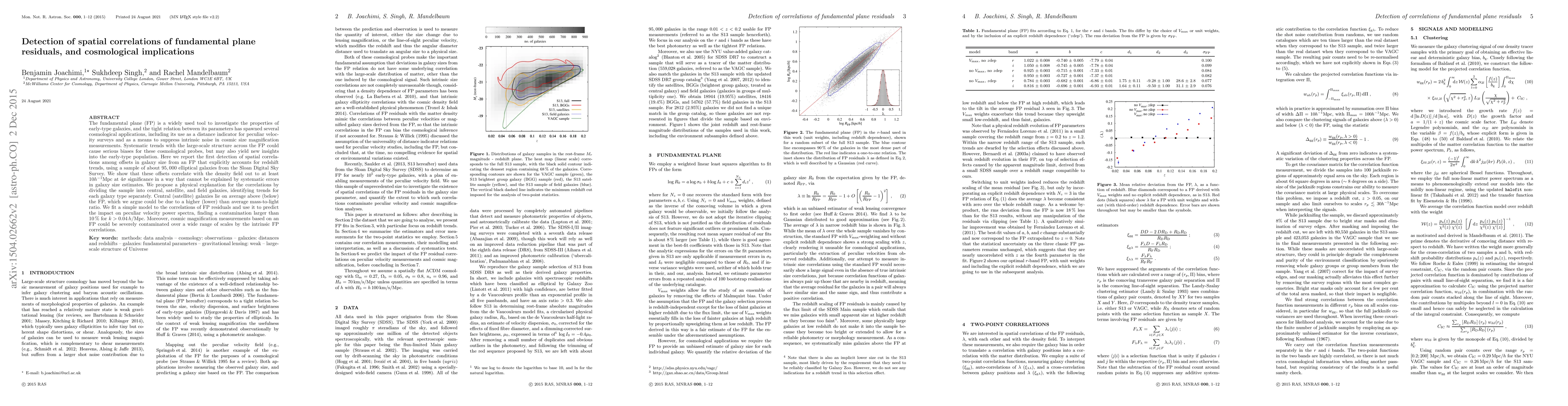 This research detects spatial correlations in galaxy size offsets from the Fundamental Plane (FP), linked to large-scale structure density, observed in a sample of 95,000 elliptype galaxies from SDSS. The correlations, extending to 10 h^-1 Mpc, can't be attributed to systematic errors. The findings suggest central galaxies exceed, and satellite galaxies fall below, the FP due to mass-to-light ratio differences. The study predicts significant contamination (>10%) in peculiar velocity power spectra and cosmic magnification measurements based on the FP.