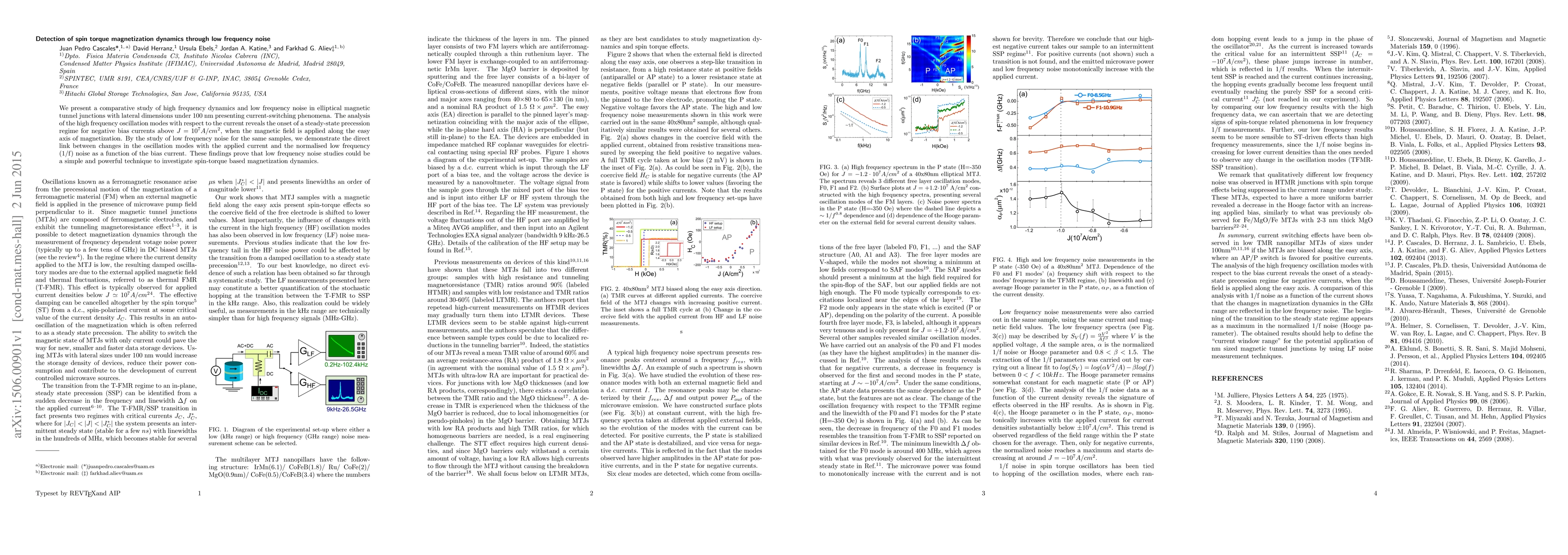 Researchers found that low-frequency noise in magnetic tunnel junctions can detect spin-torque magnetization dynamics, providing a simple method to investigate this phenomenon. They observed changes in oscillation modes with applied current, linking them to low-frequency noise for negative bias currents above $J=10^7 A/cm^2$.