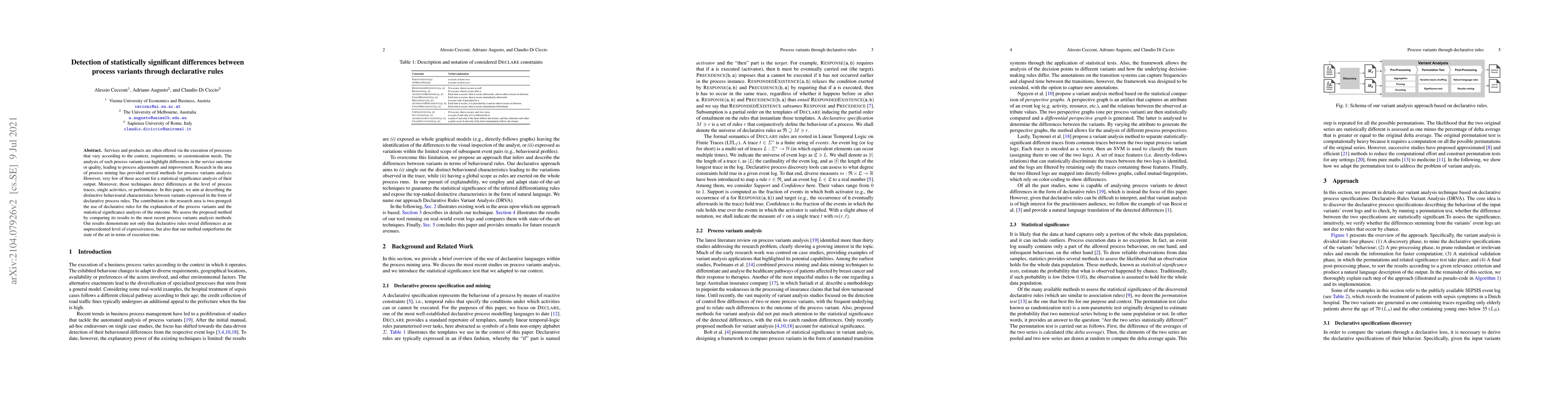 This paper proposes a method for detecting statistically significant differences between process variants using declarative rules, offering a higher level of expressiveness compared to existing process mining techniques. The method is shown to outperform current methods in both the clarity of explanation and execution time.