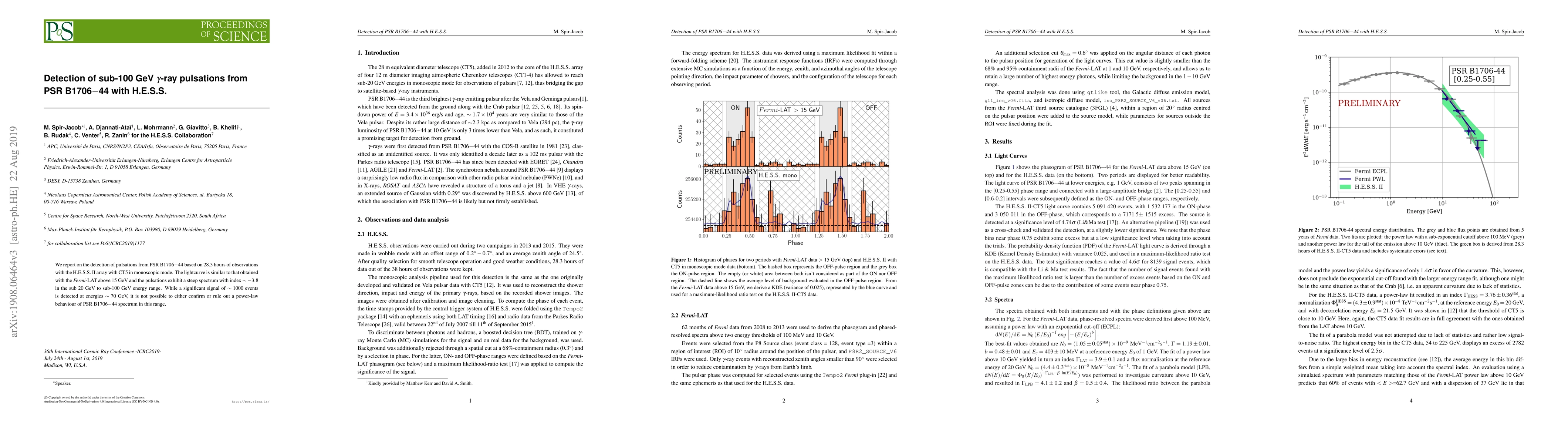 The H.E.S.S telescope detected pulsations from PSR B1706-44 with a steep spectrum in the sub 20 GeV to sub-100 GeV energy range, similar to Fermi-LAT observations above 15 GeV.