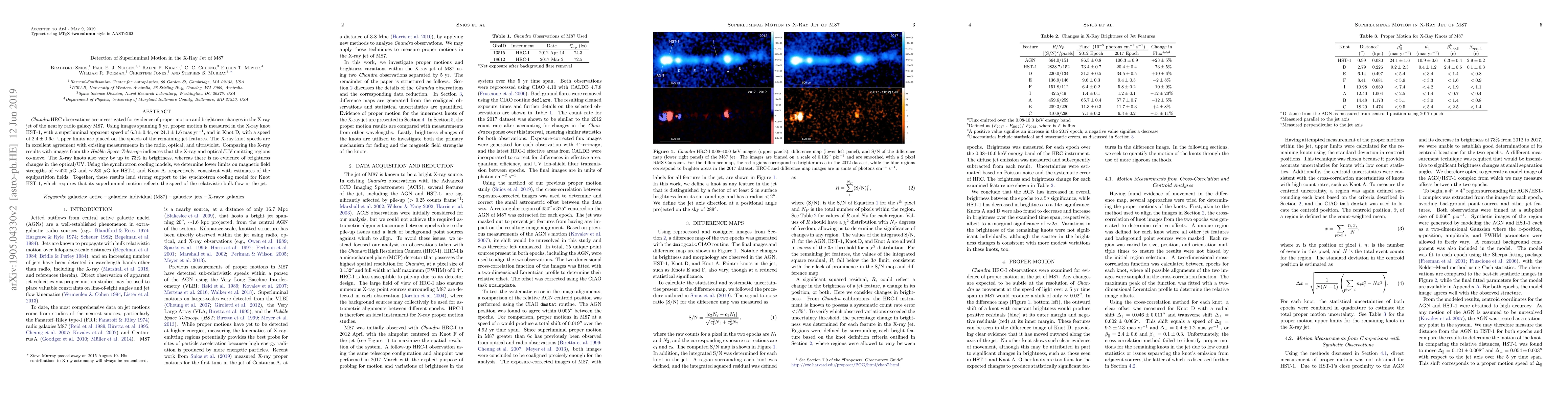 This paper reports the detection of superluminal motion in the X-ray jet of M87, measuring speeds of $6.3 \pm 0.4 c$ for HST-1 and $2.4\pm 0.6c$ for Knot D. The findings support the synchrotron cooling model and suggest the X-ray and optical/UV regions co-move.