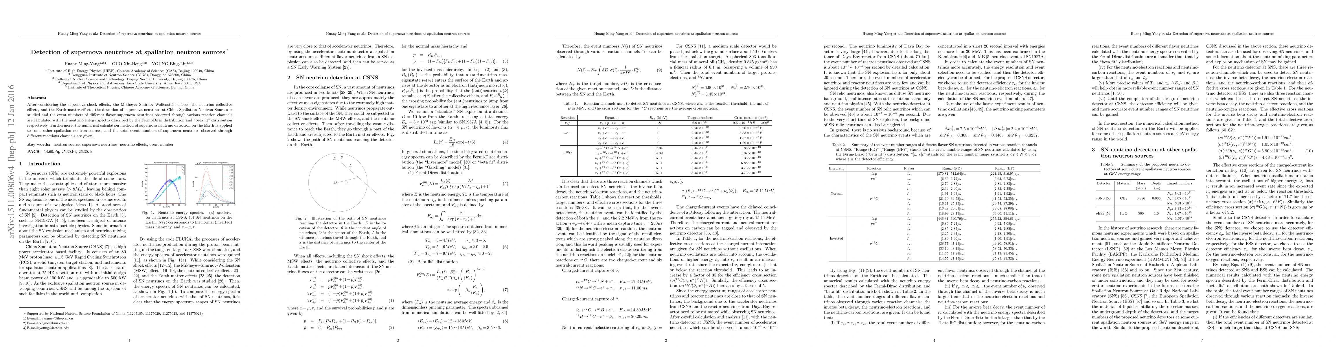 After considering the supernova shock effects, the Mikheyev-Smirnov-Wolfenstein effects, the neutrino collective effects, and the Earth matter effects, the detection of supernova neutrinos at China Spallation Neutron Sources is studied and the event numbers of different flavor supernova neutrinos observed through various reaction channels are calculated with the neutrino energy spectra described by the Fermi-Dirac distribution and "beta fit" distribution respectively. Furthermore, the numerical calculation method of supernova neutrino detection on the Earth is applied to some other spallation neutron sources, and the total event numbers of supernova neutrinos observed through different reactions channels are given.