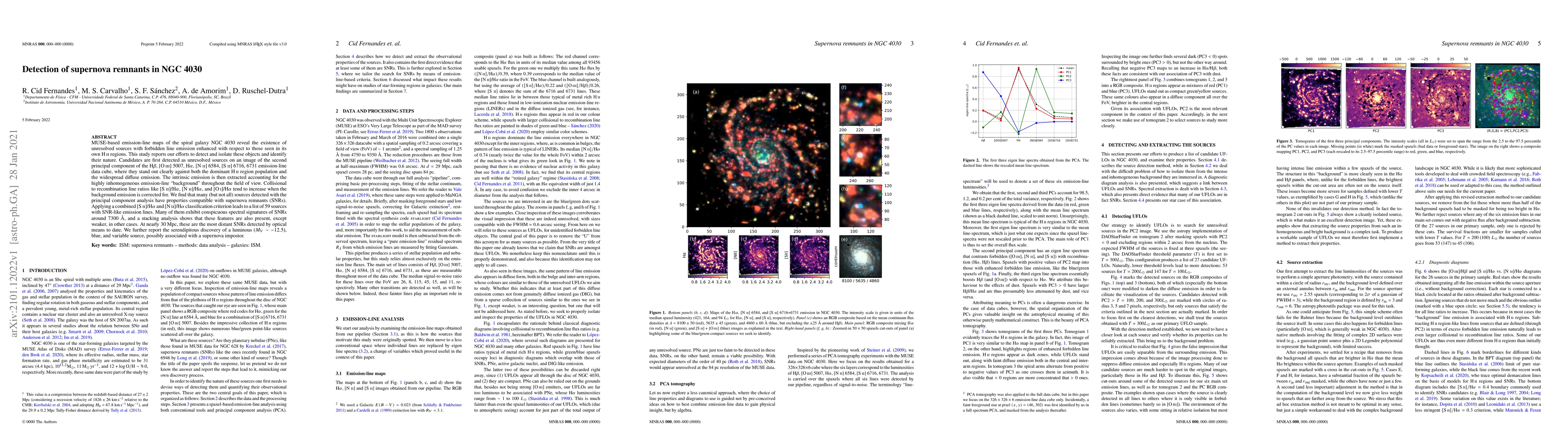 MUSE-based emission-line maps of the spiral galaxy NGC 4030 reveal the existence of unresolved sources with forbidden line emission enhanced with respect to those seen in its own HII regions. This study reports our efforts to detect and isolate these objects and identify their nature. Candidates are first detected as unresolved sources on an image of the second principal component of the Hb, [OIII]5007, Ha, [NII]6584, [SII]6716, 6731 emission-line data cube, where they stand out clearly against both the dominant HII region population and the widespread diffuse emission. The intrinsic emission is then extracted accounting for the highly inhomogeneous emission-line "background" throughout the field of view. Collisional to recombination line ratios like [SII]/Ha, [NII]/Ha, and [OI]/Ha tend to increase when the background emission is corrected for. We find that many (but not all) sources detected with the principal component analysis have properties compatible with supernova remnants (SNRs). Applying a combined [SII]/Ha and [NII]/Ha classification criterion leads to a list of 59 sources with SNR-like emission lines. Many of them exhibit conspicuous spectral signatures of SNRs around 7300 Angs, and a stacking analysis shows that these features are also present, except weaker, in other cases. At nearly 30 Mpc, these are the most distant SNRs detected by optical means to date. We further report the serendipitous discovery of a luminous (M_V ~ -12.5), blue, and variable source, possibly associated with a supernova impostor.