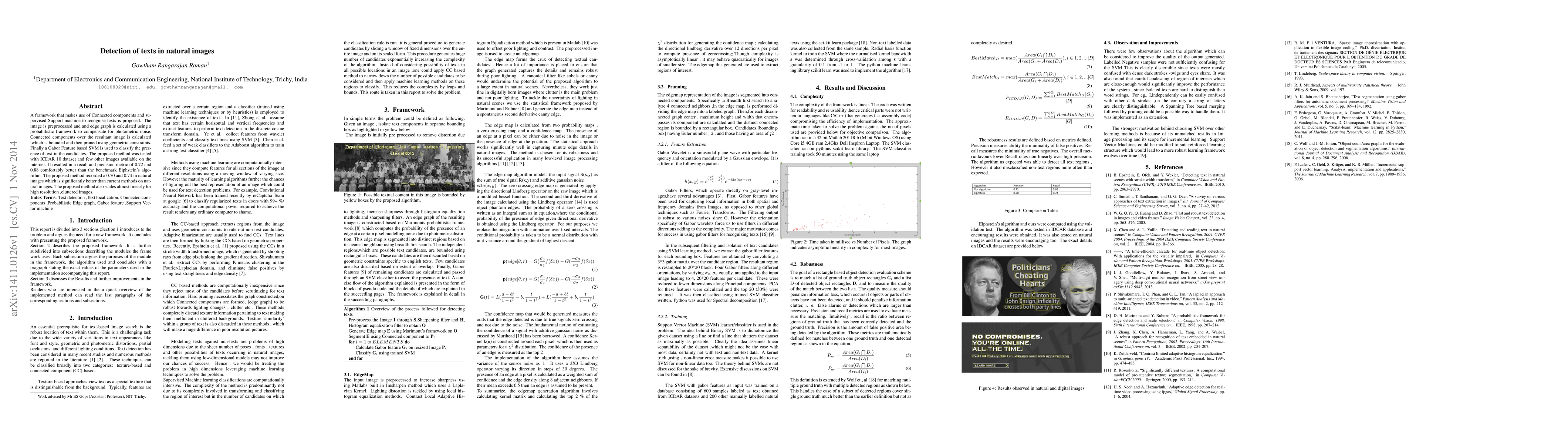 A framework that makes use of Connected components and supervised Support machine to recognise texts is proposed. The image is preprocessed and and edge graph is calculated using a probabilistic framework to compensate for photometric noise. Connected components over the resultant image is calculated, which is bounded and then pruned using geometric constraints. Finally a Gabor Feature based SVM is used to classify the presence of text in the candidates. The proposed method was tested with ICDAR 10 dataset and few other images available on the internet. It resulted in a recall and precision metric of 0.72 and 0.88 comfortably better than the benchmark Eiphstein's algorithm. The proposed method recorded a 0.70 and 0.74 in natural images which is significantly better than current methods on natural images. The proposed method also scales almost linearly for high resolution, cluttered images.