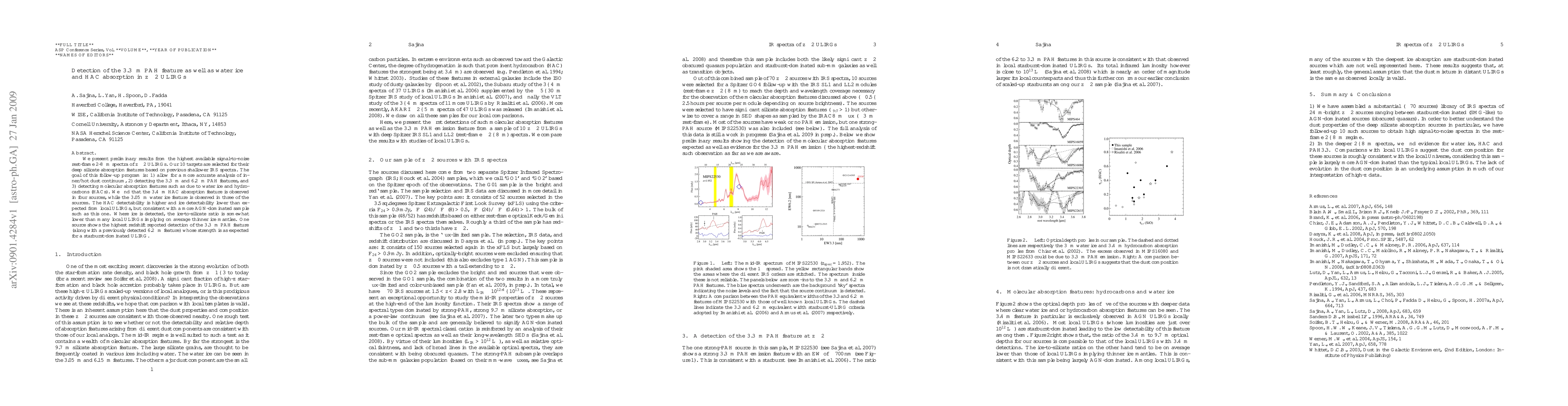 We present preliminary results from the highest available signal-to-noise rest-frame 2-8um spectra of z~2 ULIRGs. Our 10 targets are selected for their deep silicate absorption features based on previous shallower IRS spectra. The goal of this follow-up program is: 1) allow for a more accurate analysis of inner/hot dust continuum, 2) detecting the 3.3um and 6.2um PAH features, and 3) detecting molecular absorption features such as due to water ice and hydrocarbons (HACs). We find that the 3.4um HAC absorption feature is observed in four sources, while the 3.05um water ice feature is observed in three of the sources. The HAC detectability is higher and ice detectability lower than expected from local ULIRGs, but consistent with a more AGN-dominated sample such as this one. Where ice is detected, the ice-to-silicate ratio is somewhat lower than many local ULIRGs implying on average thinner ice mantles. One source shows the, to our knowledge, highest redshift reported detection of the 3.3um PAH feature (along with a previously detected 6.2um feature). The strength of the 3.3um feature is as expected for a starburst-dominated ULIRG.