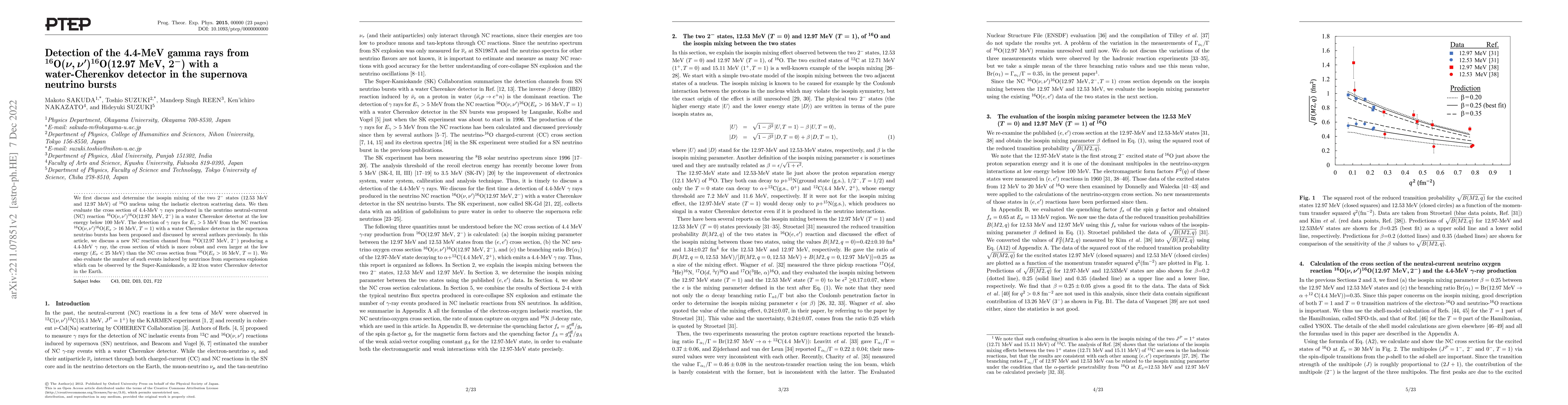 We first discuss and determine the isospin mixing of the two $2^-$ states (12.53 MeV and 12.97 MeV) of $^{16}$O nucleus using the inelastic electron scattering data. We then evaluate the cross section of 4.4-MeV $\gamma$ rays produced in the neutrino neutral-current (NC) reaction $^{16}$O($\nu, \nu^{\prime}$)$^{16}$O$(12.97 {\rm MeV}, 2^-$) in a water Cherenkov detector at the low energy below 100 MeV. The detection of $\gamma$ rays for $E_{\gamma}>5$ MeV from the NC reaction $^{16}$O($\nu, \nu^{\prime}$)$^{16}$O$(E_x>16\ {\rm MeV}, T=1$) with a water Cherenkov detector in the supernova neutrino bursts has been proposed and discussed by several authors previously. In this article, we discuss a new NC reaction channel from $^{16}$O(12.97 ${\rm MeV}, 2^-$) producing a 4.4-MeV $\gamma$ ray, the cross section of which is more robust and even larger at the low energy ($E_{\nu}<25$ MeV) than the NC cross section from $^{16}$O$(E_x>16\ {\rm MeV}, T=1$). We also evaluate the number of such events induced by neutrinos from supernova explosion which can be observed by the Super-Kamiokande, a 32 kton water Cherenkov detector in the Earth.