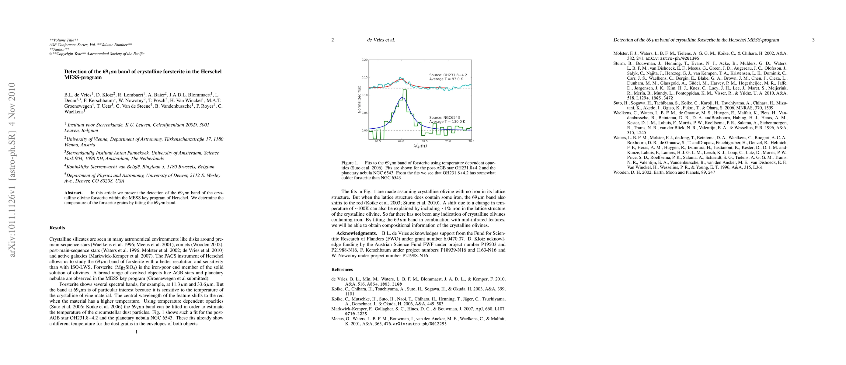 Summary: This paper reports the detection of the 69 μm band of crystalline forsterite using the Herschel MESS program, and determines the temperature of forsterite grains by analyzing the band's characteristics.
