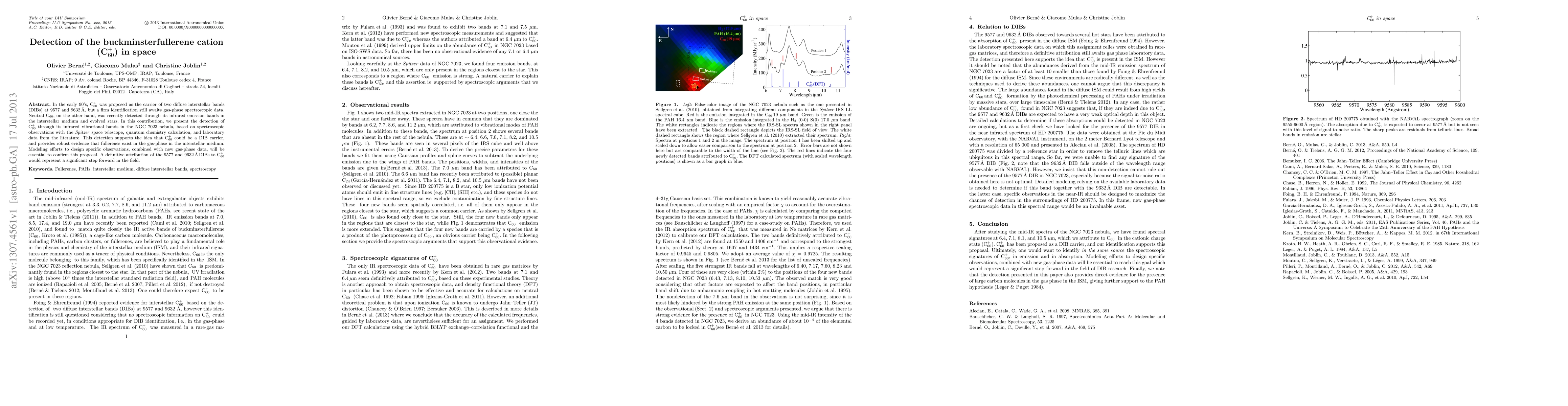In the early 90s, C60+ was proposed as the carrier of two diffuse interstellar bands (DIBs) at 957.7 and 963.2 nm, but a firm identification still awaits gas-phase spectroscopic data. Neutral C60, on the other hand, was recently detected through its infrared emission bands in the interstellar medium and evolved stars. In this contribution, we present the detection of C60+ through its infrared vibrational bands in the NGC 7023 nebula, based on spectroscopic observations with the Spitzer space telescope, quantum chemistry calculation, and laboratory data from the literature. This detection supports the idea that C60+ could be a DIB carrier, and provides robust evidence that fullerenes exist in the gas-phase in the interstellar medium. Modeling efforts to design specific observations, combined with new gas-phase data, will be essential to confirm this proposal. A definitive attribution of the 957.7 and 963.2 nm DIBs to C60+ would represent a significant step forward in the field.
