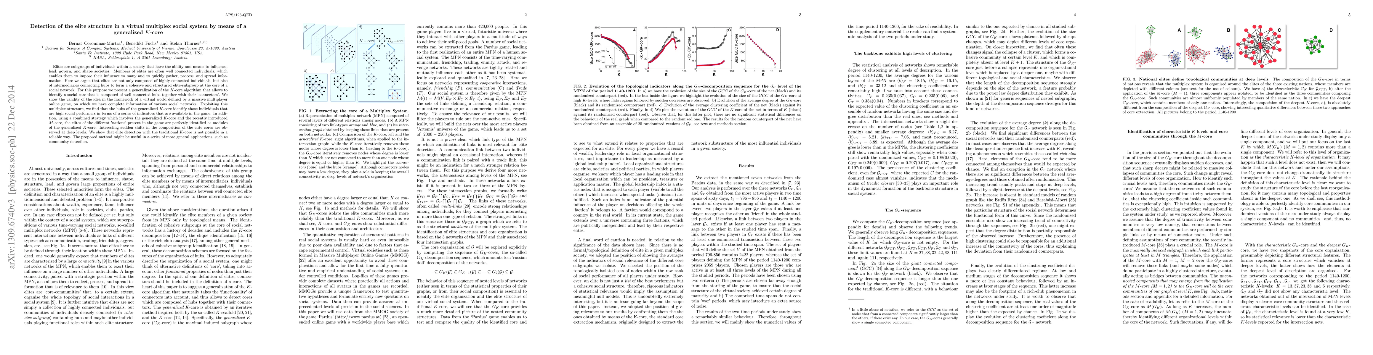 Elites are subgroups of individuals within a society that have the ability and means to influence, lead, govern, and shape societies. Members of elites are often well connected individuals, which enables them to impose their influence to many and to quickly gather, process, and spread information. Here we argue that elites are not only composed of highly connected individuals, but also of intermediaries connecting hubs to form a cohesive and structured elite-subgroup at the core of a social network. For this purpose we present a generalization of the $K$-core algorithm that allows to identify a social core that is composed of well-connected hubs together with their `connectors'. We show the validity of the idea in the framework of a virtual world defined by a massive multiplayer online game, on which we have complete information of various social networks. Exploiting this multiplex structure, we find that the hubs of the generalized $K$-core identify those individuals that are high social performers in terms of a series of indicators that are available in the game. In addition, using a combined strategy which involves the generalized $K$-core and the recently introduced $M$-core, the elites of the different 'nations' present in the game are perfectly identified as modules of the generalized $K$-core. Interesting sudden shifts in the composition of the elite cores are observed at deep levels. We show that elite detection with the traditional $K$-core is not possible in a reliable way. The proposed method might be useful in a series of more general applications, such as community detection.