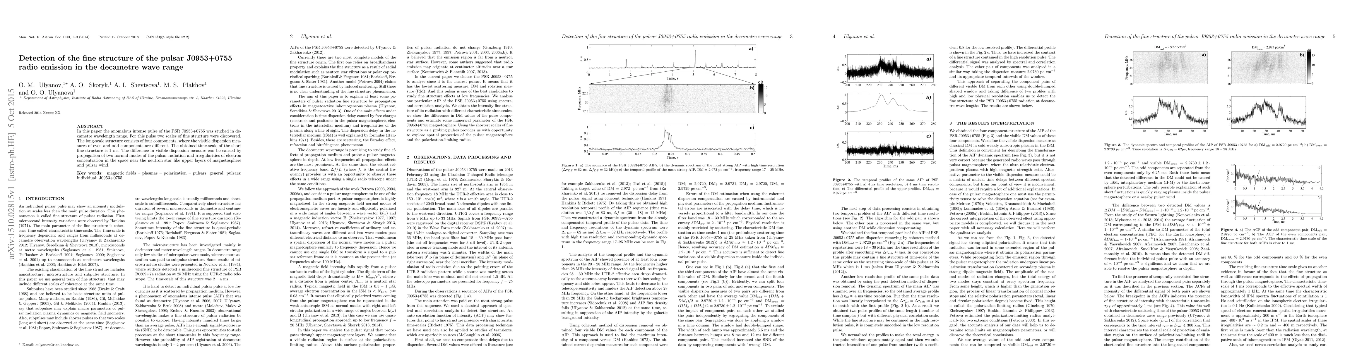 In this paper the anomalous intense pulse of the PSR J0953+0755 was studied in decametre wavelength range. For this pulse two scales of fine structure were discovered. The long-scale structure consists of four components, where the visible dispersion measures of even and odd components are different. The obtained time-scale of the short fine structure is 1 ms. The difference in visible dispersion measure can be caused by propagation of two normal modes of the pulsar radiation and irregularities of electron concentration in the space near the neutron star like upper layers of magnetosphere and pulsar wind.