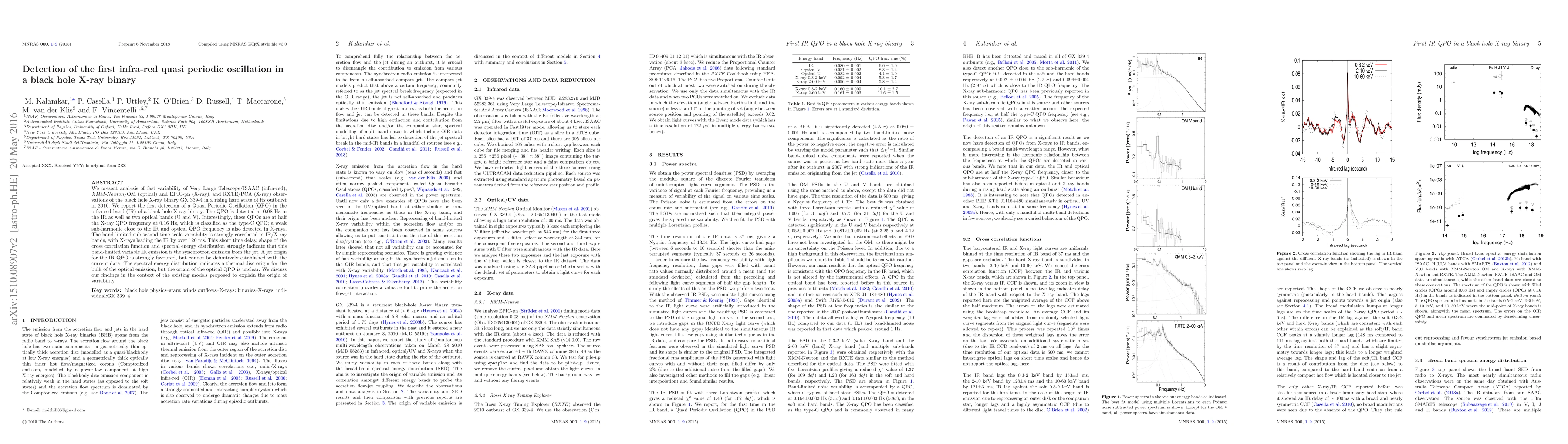 The paper detects a Quasi-Periodic Oscillation in an infra-red band of a black hole X-ray binary for the first time, finding correlations between IR/X-ray variability that suggest synchrotron emission from a jet.