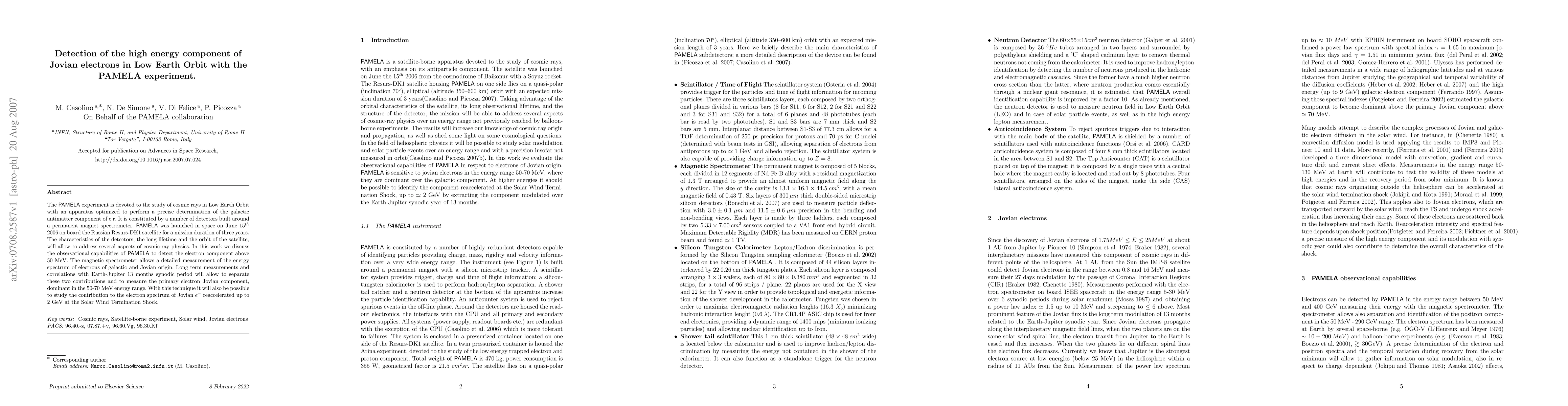 The PAMELA experiment, launched in 2006, uses a permanent magnet spectrometer to detect cosmic rays in Low Earth Orbit, focusing on the high energy Jovian electron component above 50 MeV. By analyzing long-term data and correlating with Earth-Jupiter interactions, PAMELA can distinguish and measure the Jovian electron contribution, including those reaccelerated up to 2 GeV.