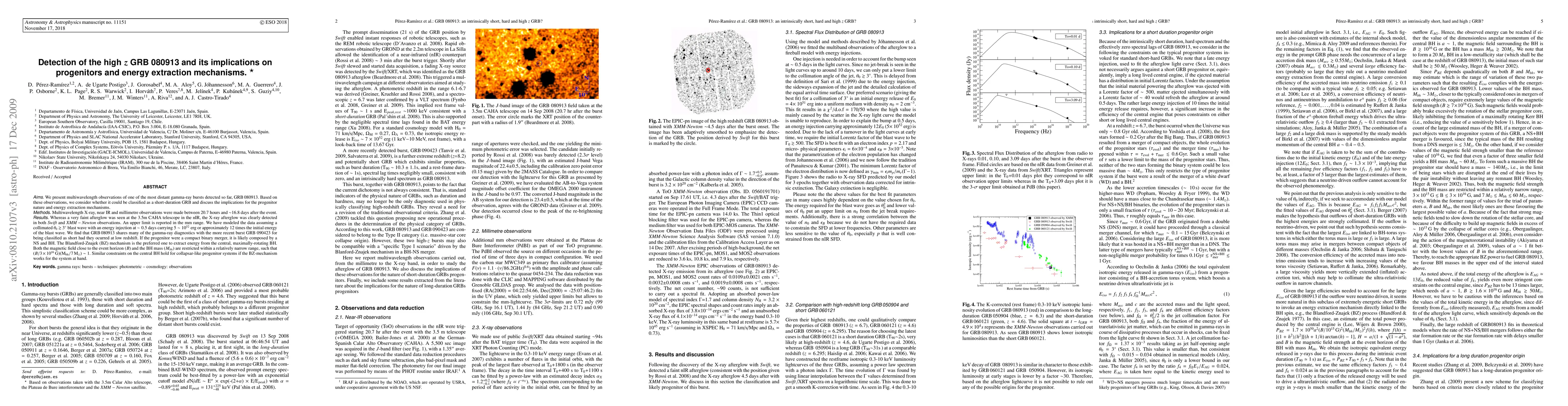 This paper presents multiwavelength observations of the distant GRB 080913, finding it shares characteristics with short-duration GRBs if observed at low redshift. The study suggests a compact binary merger, likely involving a neutron star and black hole, as the progenitor, with the Blandford-Znajek mechanism favored for energy extraction.