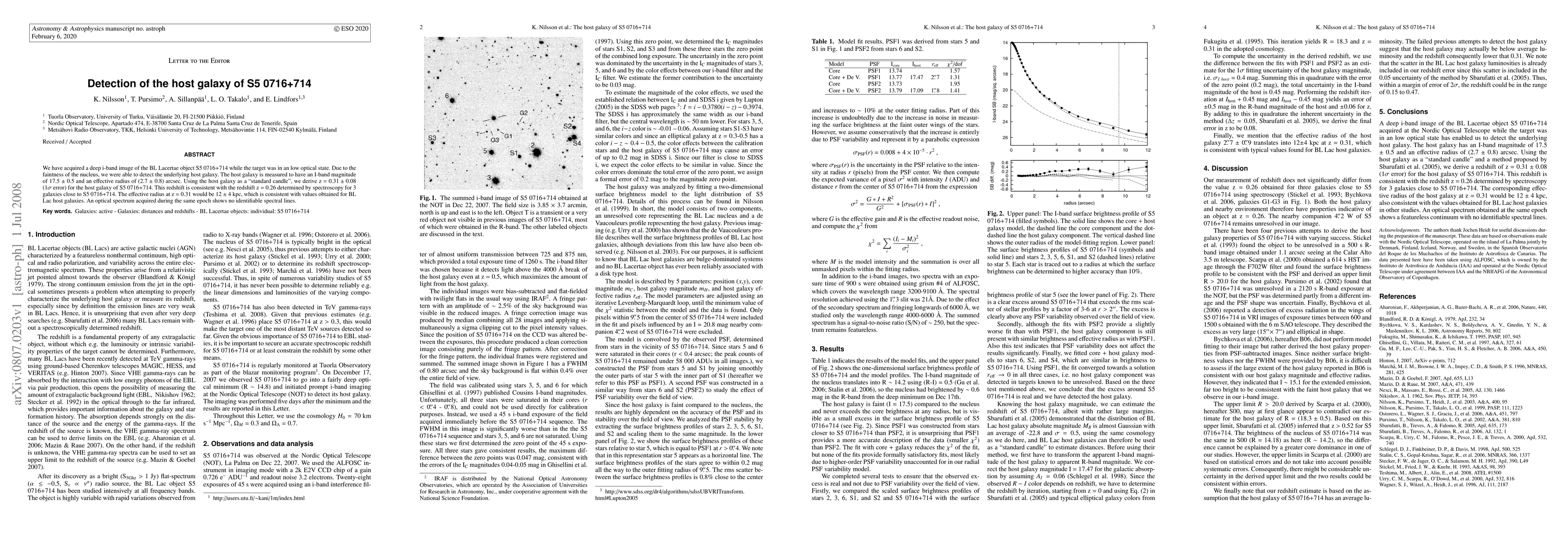 We have acquired a deep i-band image of the BL Lacertae object S5 0716+714 while the target was in an low optical state. Due to the faintness of the nucleus, we were able to detect the underlying host galaxy. The host galaxy is measured to have an I-band magnitude of 17.5 +- 0.5 and an effective radius of (2.7 +- 0.8) arcsec. Using the host galaxy as a ``standard candle'', we derive z = 0.31 +- 0.08 (1 sigma error) for the host galaxy of S5 0716+714. This redshift is consistent with the redshift z = 0.26 determined by spectroscopy for 3 galaxies close to S5 0716+714. The effective radius at z = 0.31 would be 12 +- 4 kpc, which is consistent with values obtained for BL Lac host galaxies. An optical spectrum acquired during the same epoch shows no identifiable spectral lines.