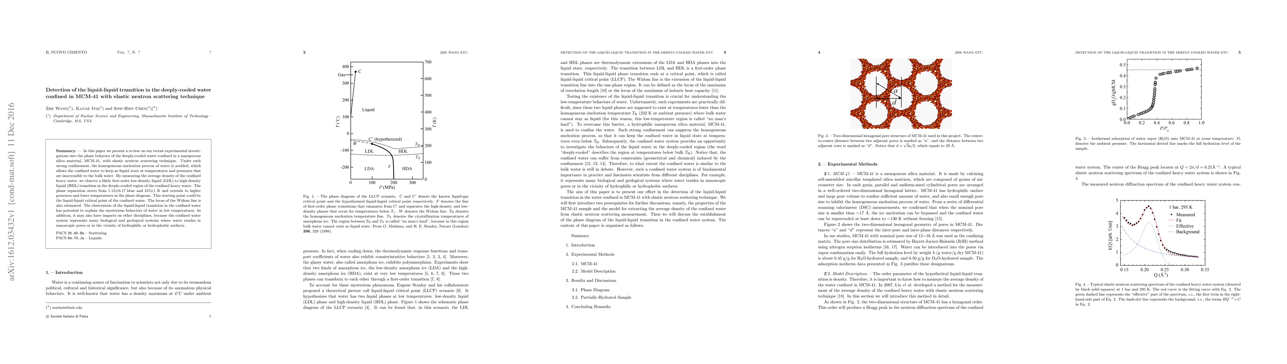 In this paper we present a review on our recent experimental investigations into the phase behavior of the deeply cooled water confined in a nanoporous silica material, MCM-41, with elastic neutron scattering technique. Under such strong confinement, the homogeneous nucleation process of water is avoided, which allows the confined water to keep its liquid state at temperatures and pressures that are inaccessible to the bulk water. By measuring the average density of the confined heavy water, we observe a likely first-order low-density liquid (LDL) to high-density liquid (HDL) transition in the deeply cooled region of the confined heavy water. The phase separation starts from 1.12 +- 0.17 kbar and 215 +- 1K and extends to higher pressures and lower temperatures in the phase diagram. This starting point could be the liquid-liquid critical point of the confined water. The locus of the Widom line is also estimated. The observation of the liquid-liquid transition in the confined water has potential to explain the mysterious behaviors of water at low temperatures. In addition, it may also have impacts on other disciplines, because the confined water system represents many biological and geological systems in which water resides in nanoscopic pores or in the vicinity of hydrophilic or hydrophobic surfaces.